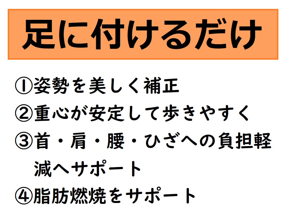 足底筋群をしっかり使えるようになり、姿勢が正されることでインナーマッスルが活性化。運動効率がアップし、脂肪燃焼のサポートに。ラクに歩けるようになります。