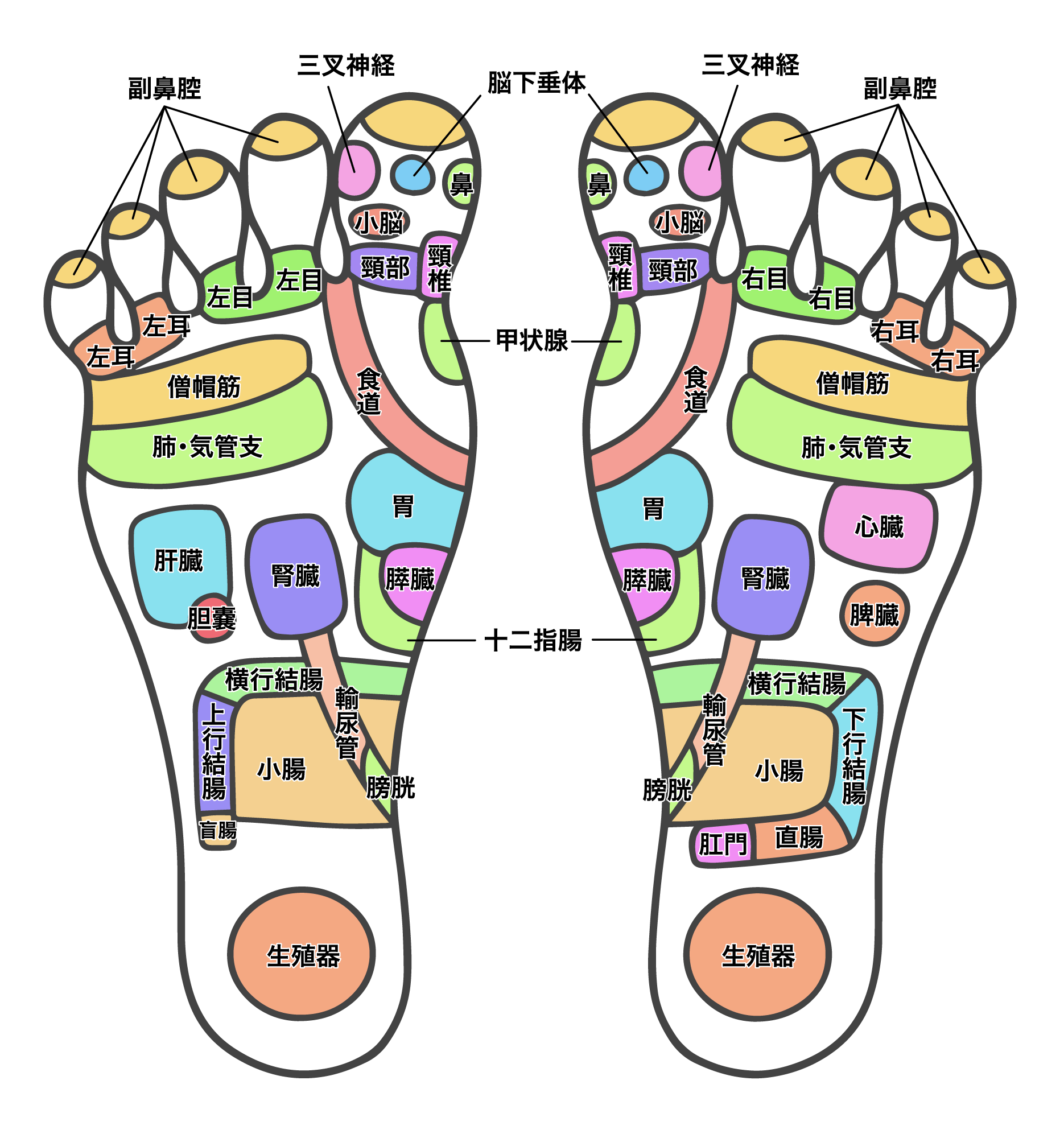 足裏には、60~70個程度の反射区(ツボ)があります。身体の不調が起きた場合、足裏のツボが硬くなったり、カサカサしたり、押すと痛みを感じたりします。この痛みを感じるツボをもみほぐすと、身体の不調を緩和することが可能になります。