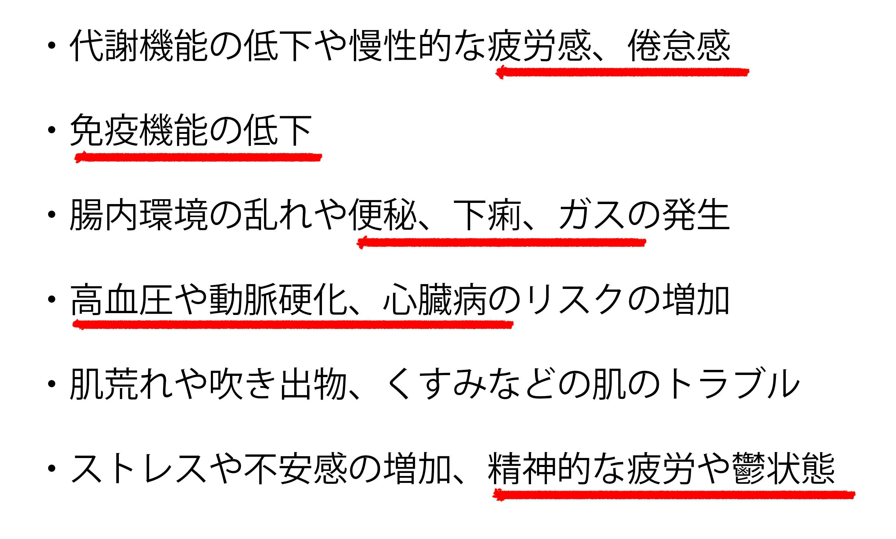 老廃物の蓄積は健康面にも影響を及ぼし、たとえば腸内環境の乱れや代謝の低下などを引き起こします。 これらは便秘や肌荒れ、むくみ、手足の冷えなどの原因になることも。