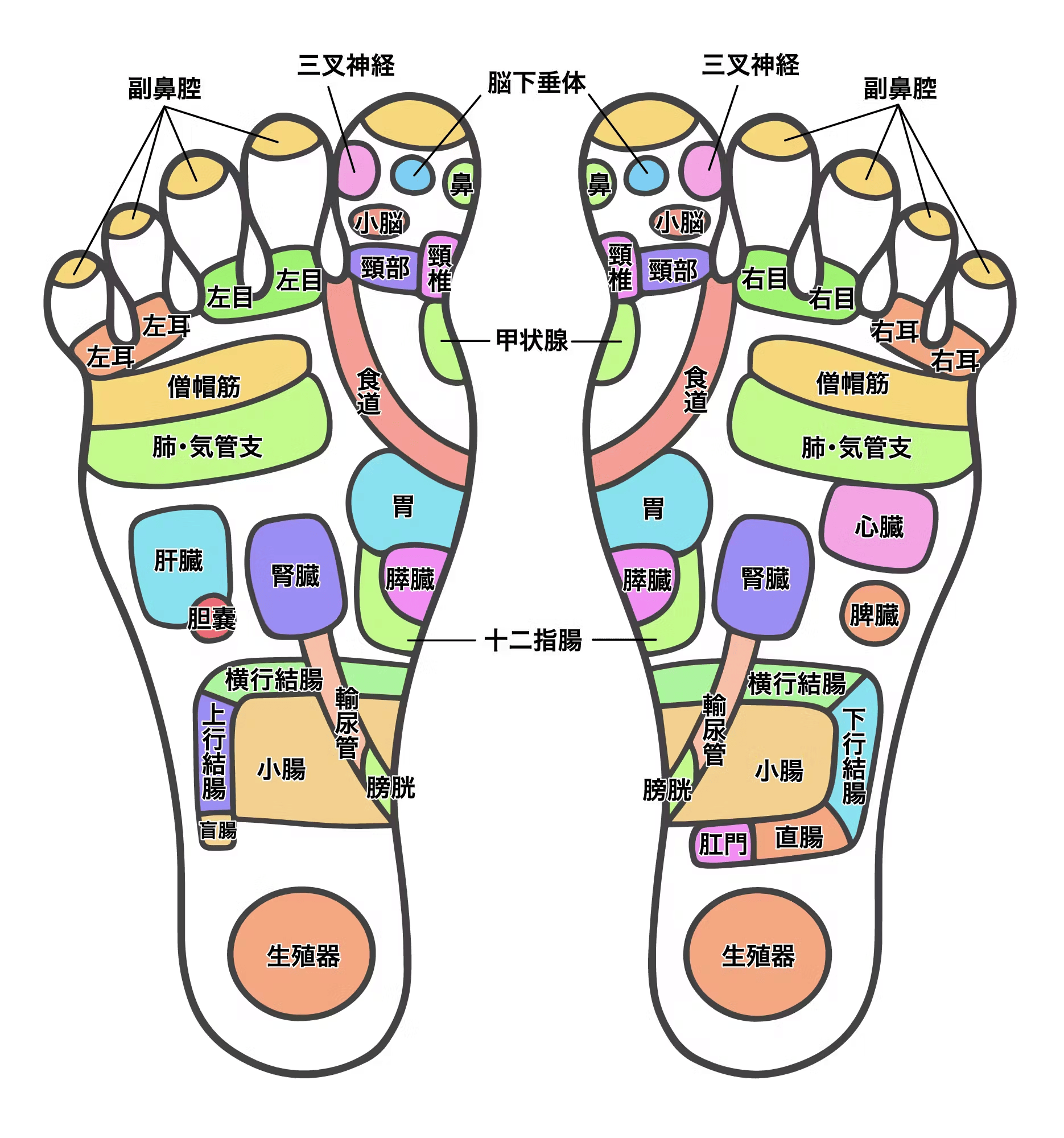 足裏には、全身の内臓や器官とつながる**60〜70個ほどの反射区(ツボ)**があるといわれています。