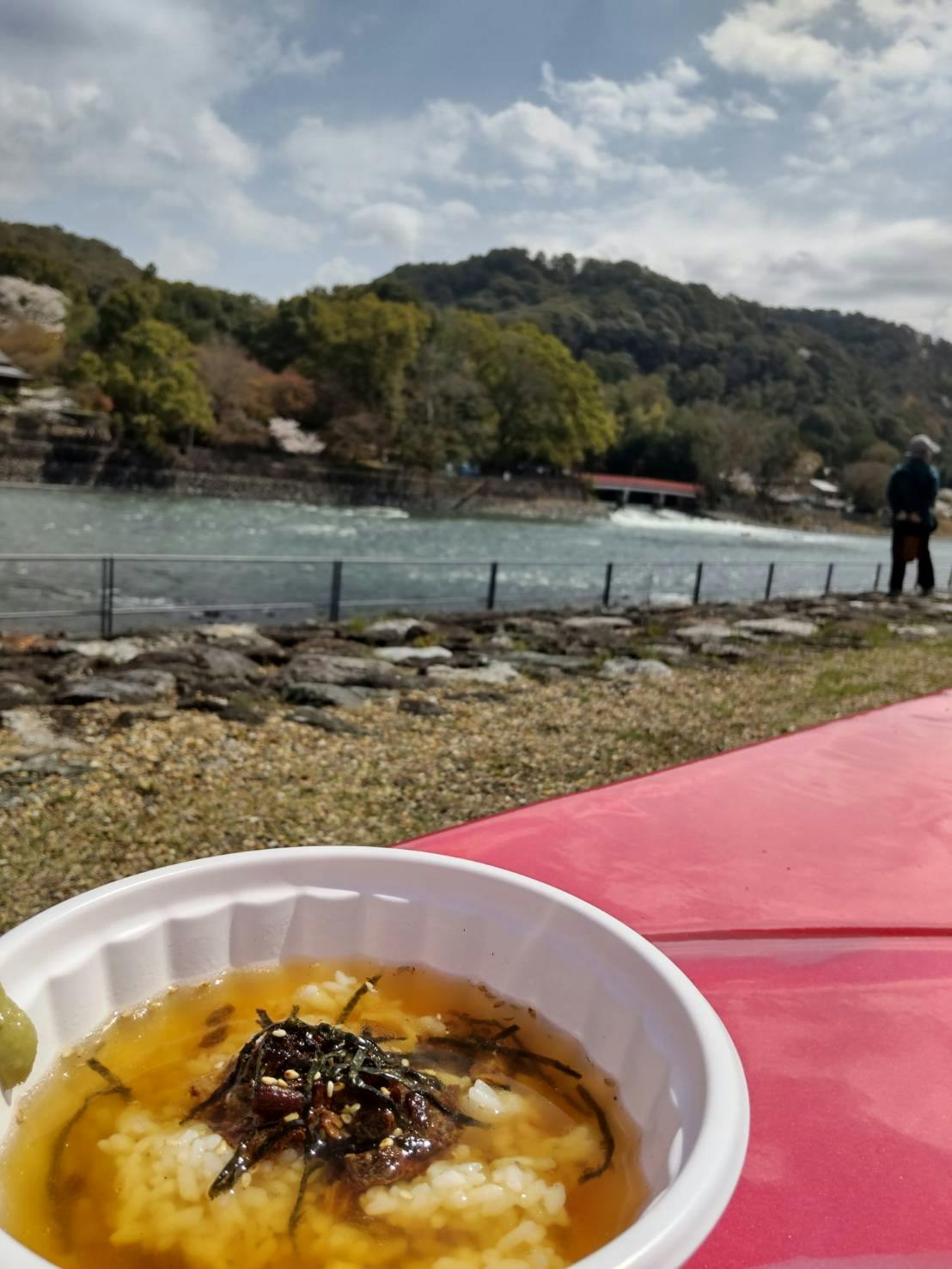 うなぎの宇治茶漬けを宇治川をみながら。他にも、唐揚げ、抹茶シフォンケーキ、茶団子…どれも魅力的。炭山の陶器市も楽しみました。