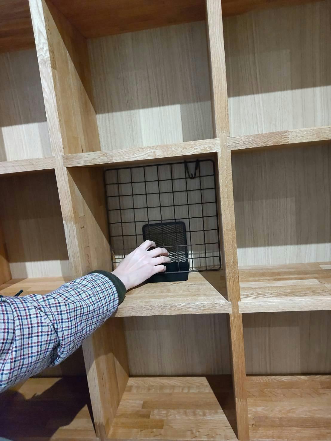 ディスプレイ案を考案中の箱主さん。箱の実際の大きさを試しにおいでくださいました。