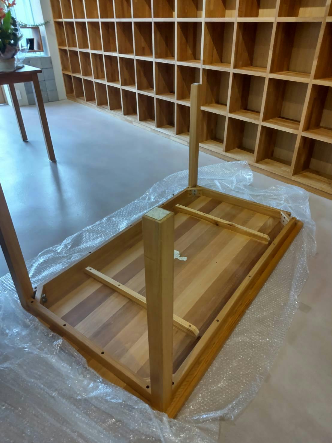 1Fフロアに天然無垢のテーブルを大小1台ずつ購入しました。組み立てはご近所の箱主さんが手伝いに来てくださって一緒に設置しました。ありがとう!!