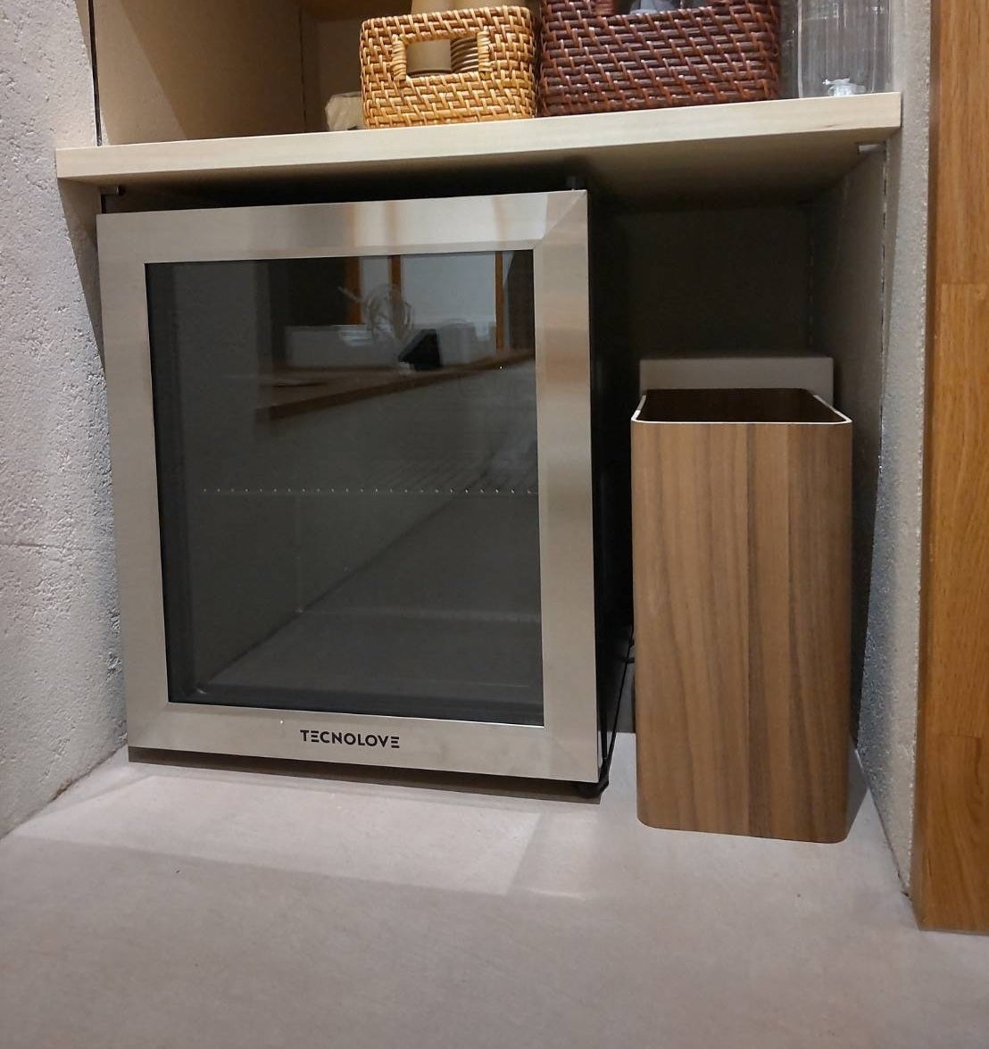 セルフカフェコーナーの足元。庫内が見える大人かっこいい小型冷蔵庫を購入しました。もうすぐ宇治も暑い季節!これで冷たいお飲み物もご提供できます!