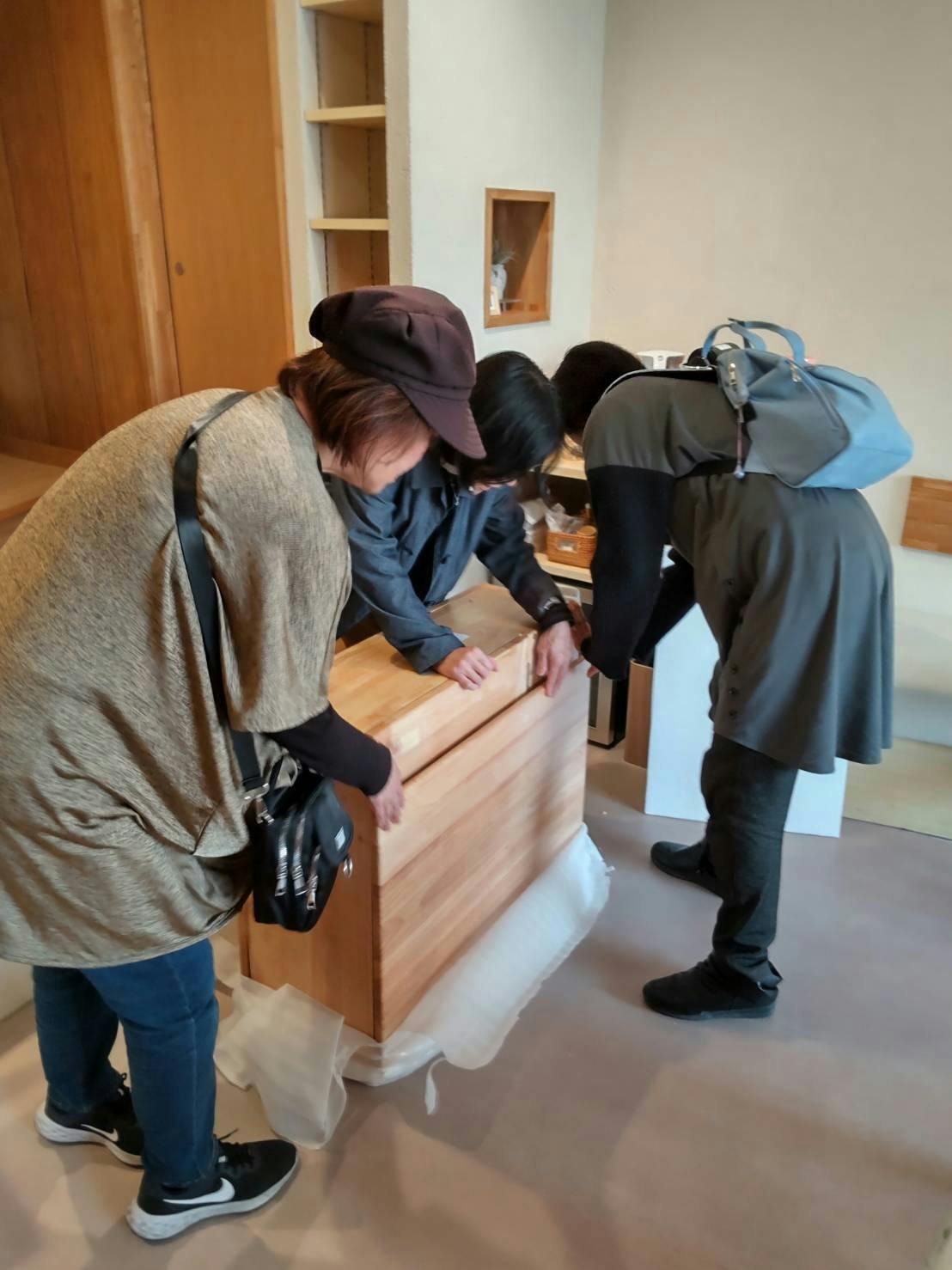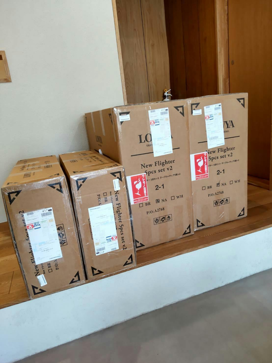 2階シェアスペース用の折り畳み家具が届いて。梱包は箱主さん達と解いたけど、重たくて2階に運べません。