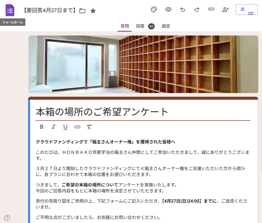 箱主さんオーナー権をお持ちの方には、4/21(月)の午後にCAMPFIRE経由でフォームリンク付きのメールも送っております。