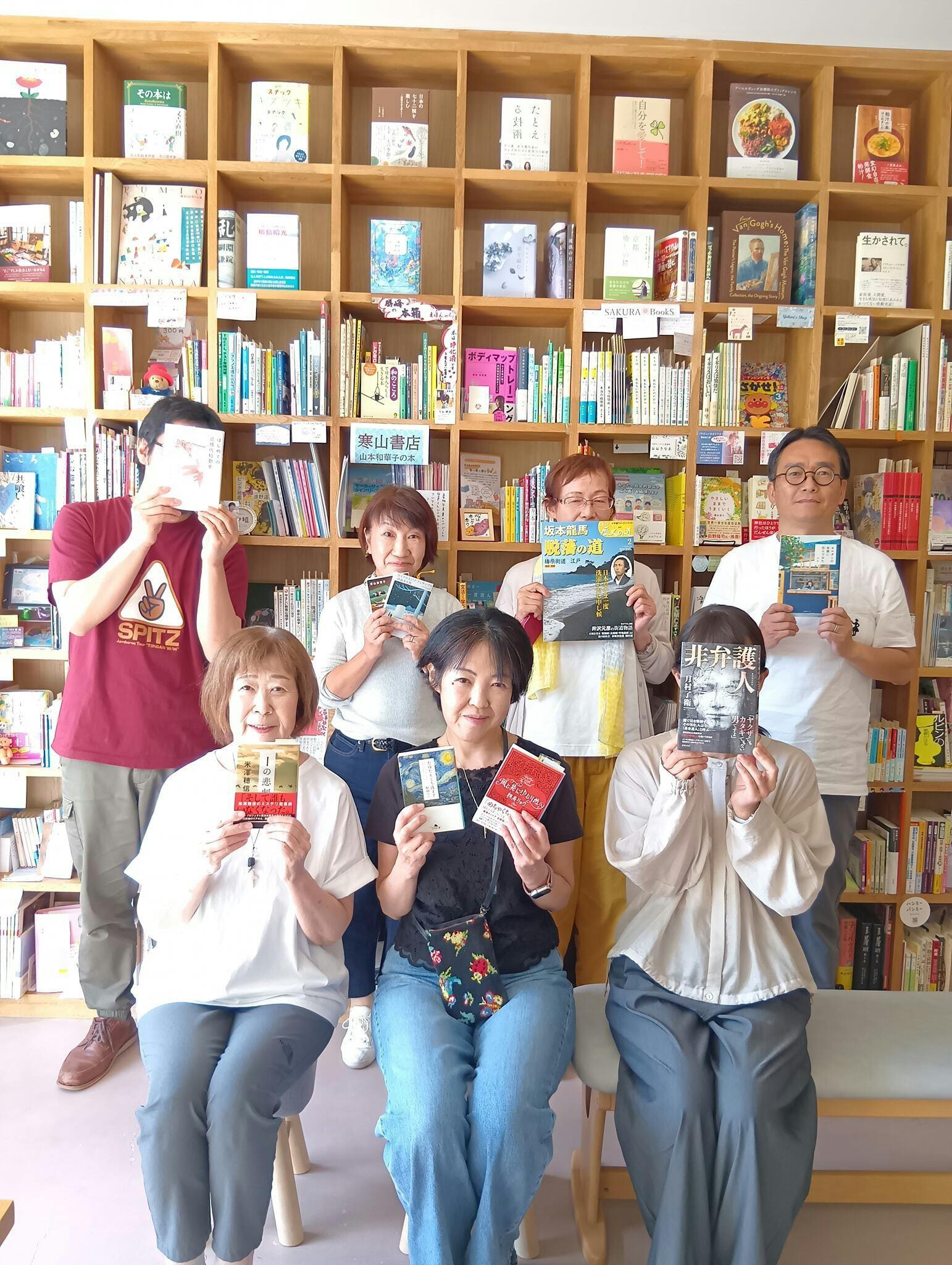 月一開催中の「ゆるやか読書会」最後に本箱の前で集合写真 朝の店内。