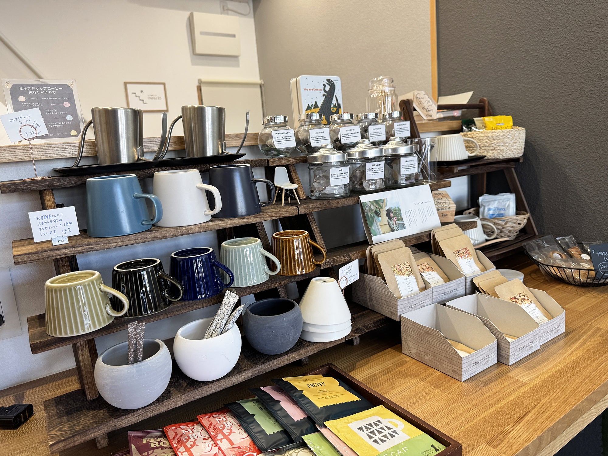 お店にはセルフカフェを常設し、本の他に、簡単なドリンクやフード類を販売いたします。そこでも【くらしをちょっと、ゆたかに】をテーマに、お店が厳選するこだわりのドリンクや軽食・お菓子など、私たちが繋がりのなかで発見した珍しいもの、美味しいものを販売します(写真はイメージです)。