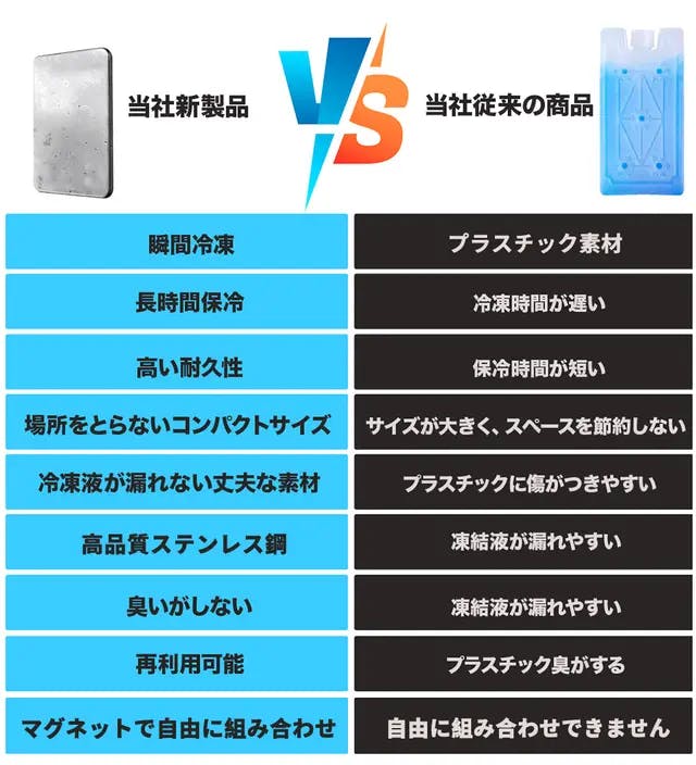 凍るのが速く、長時間解けにくい次世代保冷剤-【磁石付きステンレス保冷剤】。こだわり抜いた独自の配合により長時間氷点下の温度を維持することができ、保冷剤を冷蔵庫に入れて4〜6時間だけで使用で可能です!