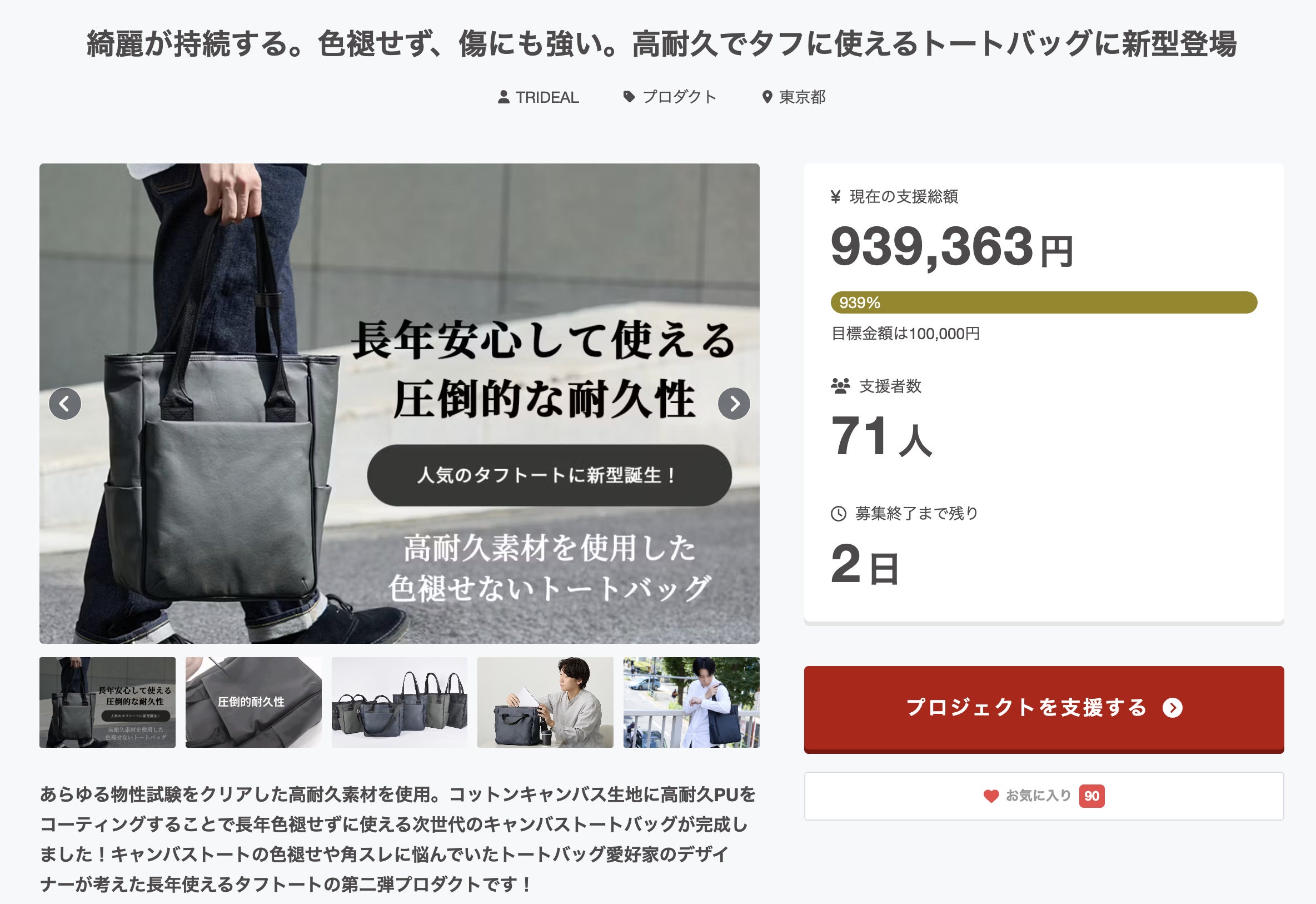 高耐久素材を使用したタフトートのプロジェクトもとうとうラスト3日になりました!
