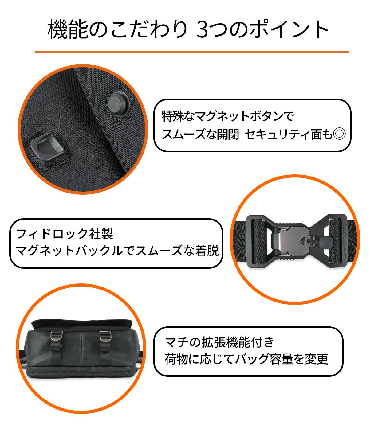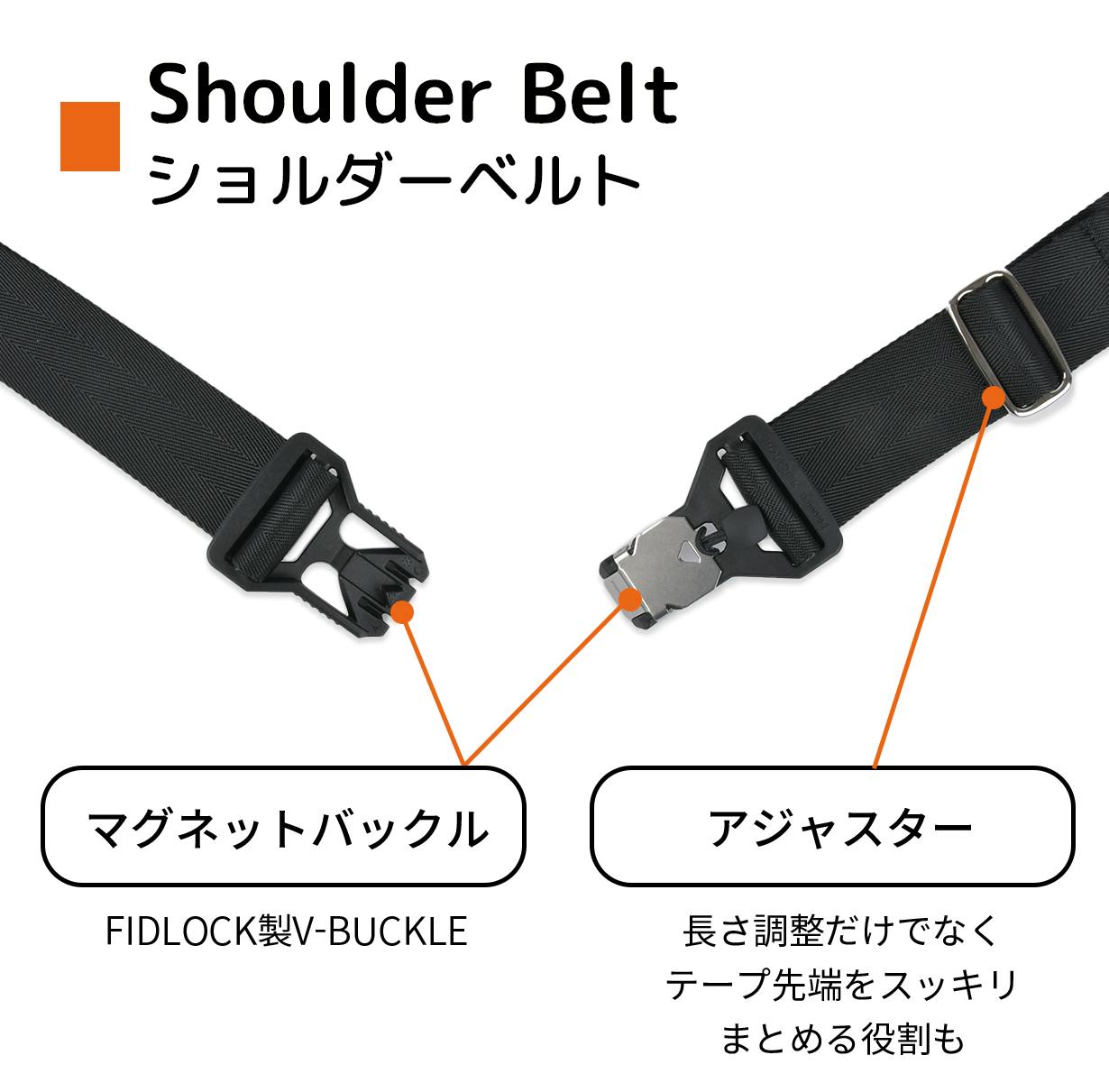 ショルダーベルトには、ドイツのパーツブランド"FIDLOCK"のマグネットバックルを使用しています。