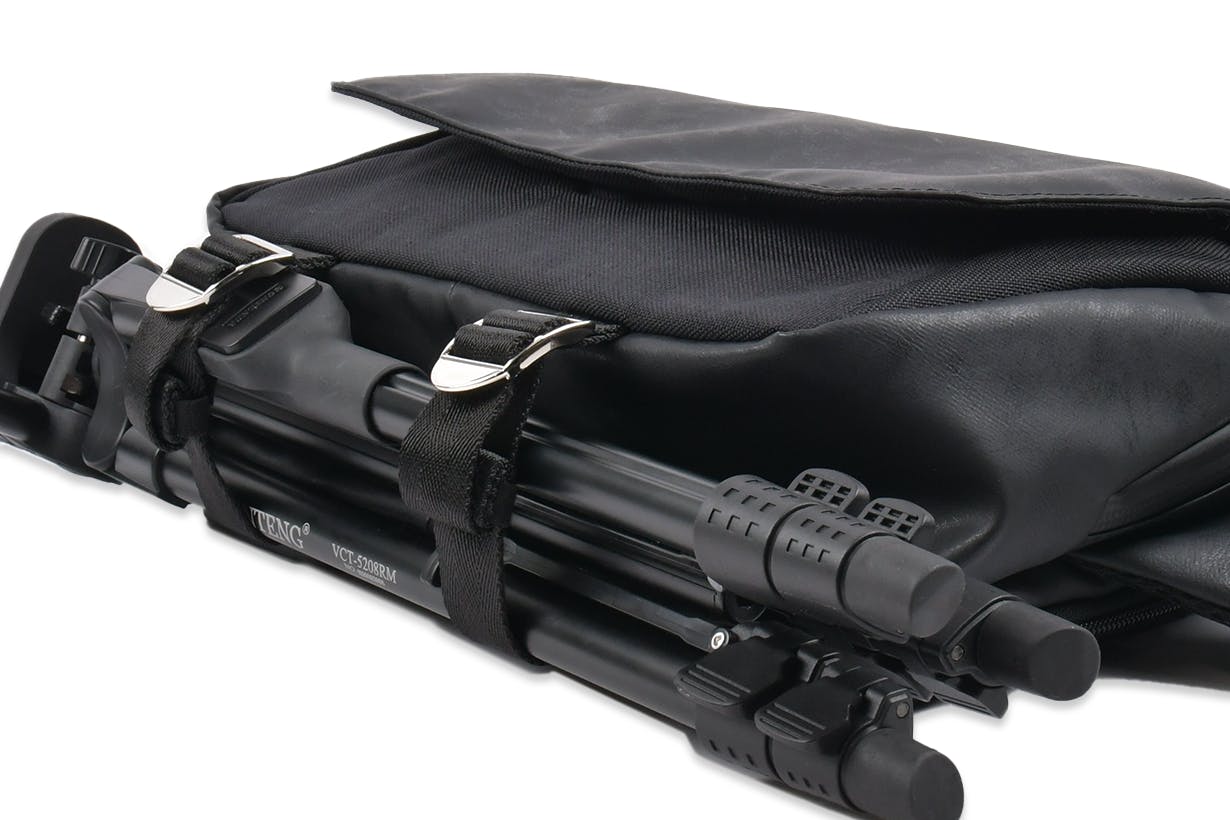拡張用の底マチのベルト部分には、三脚や折り畳み傘を固定することができます。