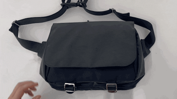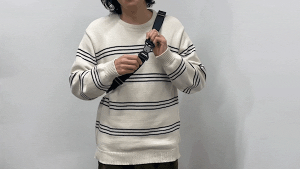 通常時はコンパクトなスリングバッグですが、底部分のベルトを調整することで、マチを13cmまで拡張することができます。