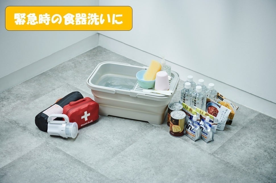 緊急時には、バスケットの中に必要なものを入れて持ち運ぶのはもちろん、臨時の食器洗い場としても使うことができます。トレーはスリット状で水切りもラクラク!
