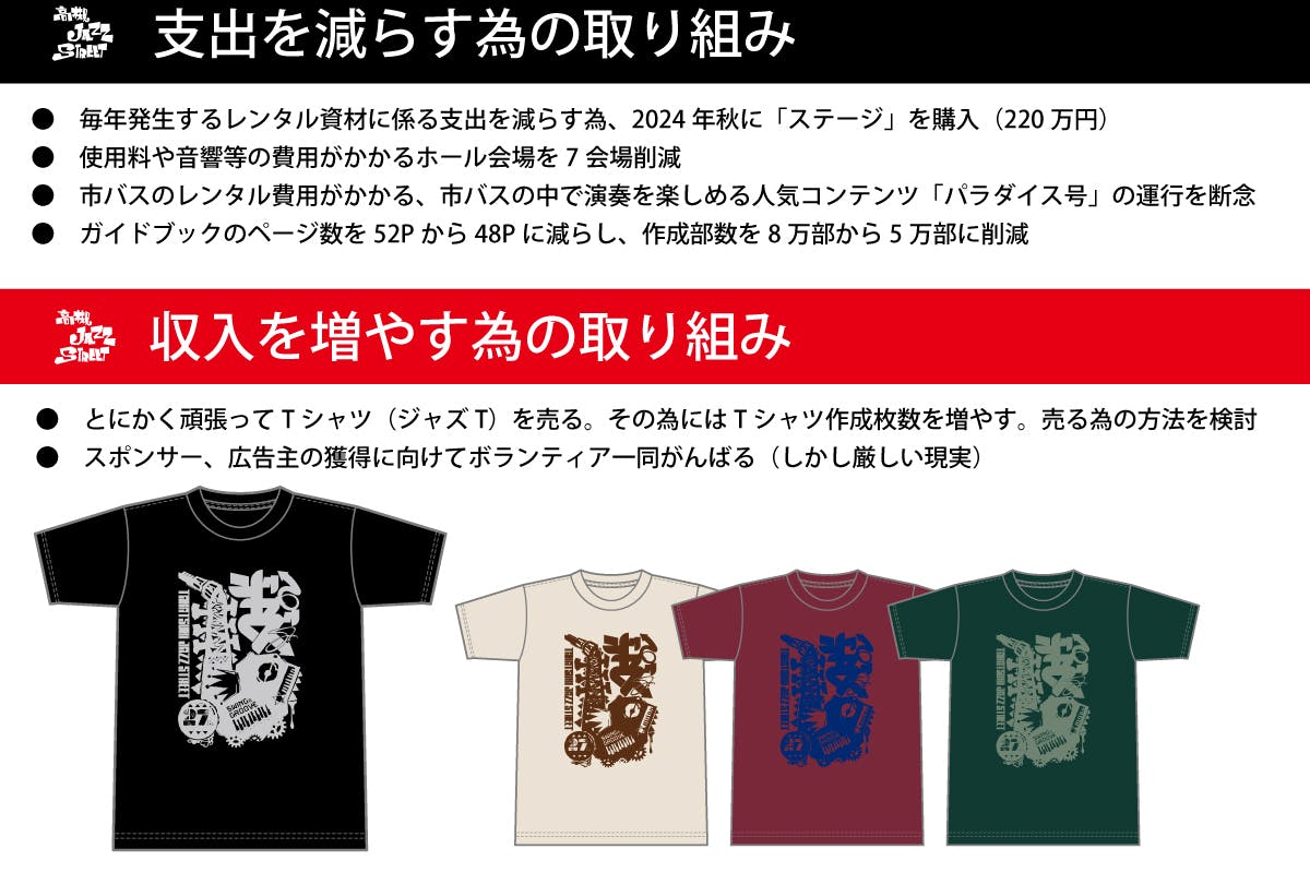 しかし、支出を減らす為の取り組みの大半は、高槻ジャズストリートの魅力が少し減ってしまう。そんな苦しい決断なのです。しかし無いものは出せません。