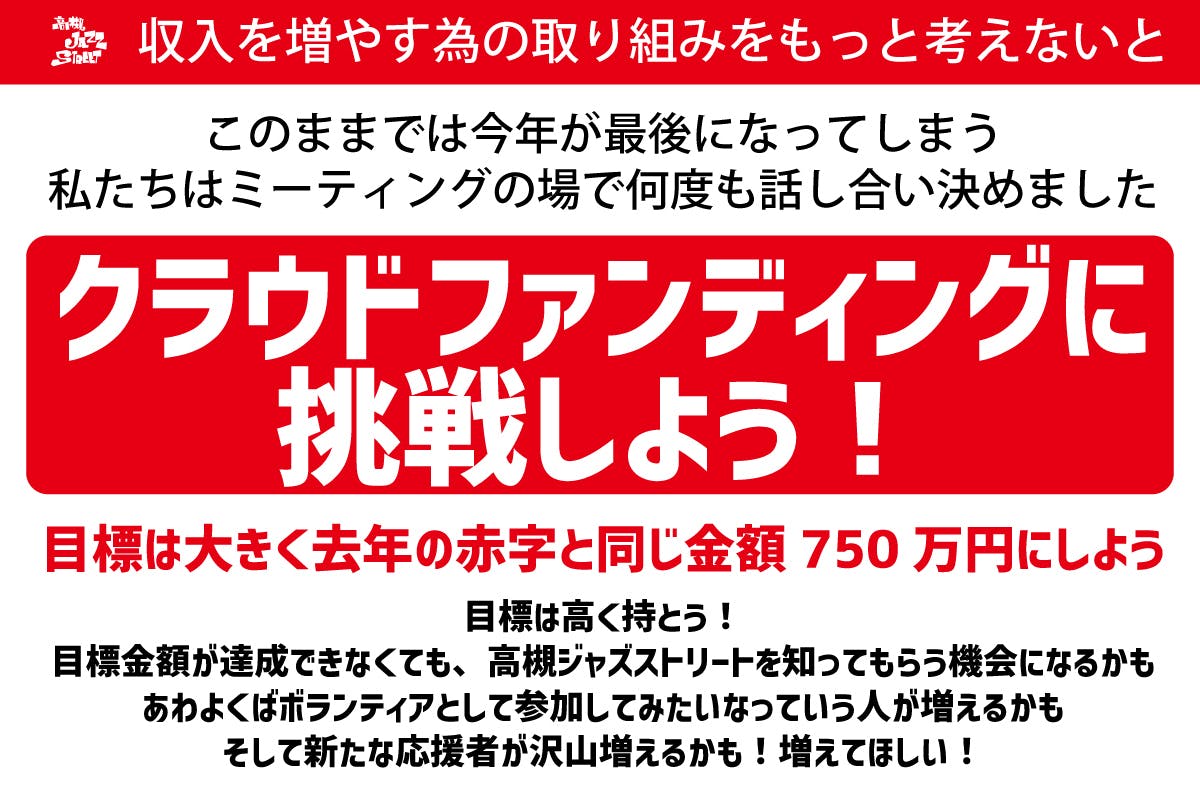 2025/12/18 17:06高槻ジャズストリート実行委員会です。2025年も残すところ、あと2週間となりました。1年前の今頃、私たちは「第27回 高槻ジャズストリートをどうすれば開催できるのか」と、頭を悩ませていました。その中で決断したのが、クラウドファンディングへの挑戦でした。2025年1月から準備を進め、3月28日にクラウドファンディングをスタート。終了は5月7日、そしてイベント本番は5月3日・4日の2日間。本番期間中の5月4日、なんと目標金額を達成することができたんです!!本番終了後は、翌朝早くからお借りした会場の清掃等後片付け。その後も残務は山積みでしたが、クラウドファンディングを通じて寄せられた、たくさんの温かい応援コメントに、疲れながらも胸がいっぱいになったことを、今もよく覚えています。高槻ジャズストリートは毎年多くの方にご参加いただくイベントとなりましたが、クラウドファンディングに挑戦したことで、みなさまの「高槻ジャズストリートへの想い」を、これまで以上に深く知ることができました。5月7日の終了日までご支援は途切れることなく続き、最終的には1,020名もの方が、高槻ジャズストリートの継続開催を応援してくださいました。そして、このプロジェクトは、CAMPFIRE(キャンプファイヤー)上半期ベストプロジェクト【地域拠点部門/共創の灯賞】に選ばれました!ありがとうございます!https://camp-fire.jp/awards高槻ジャズストリートは、地域のみなさま、出演者のみなさま、ご来場くださるみなさま、遠方から応援してくださるみなさま、そしてボランティアの仲間たち――本当に多くの方々のお力によって、ここまで続けてくることができました。おかげさまで現在私たちは、「第28回 高槻ジャズストリート(2026年5月3日4日)」 に向けた準備を進めることができています。なお、第28回高槻ジャズストリートでは、クラウドファンディングは実施しないことを決定いたしました。「クラウドファンディングは、本当に困ったときの手段にしよう」そう実行委員会で話し合って決めたからです。クラウドファンディングに頼らず、どうすれば赤字にならずに開催できるのか。どうすれば、もっと多くのボランティア仲間が集まってくれるのか。1年前と同じように、2026年の運営について、また頭を悩ませているのが正直なところです。そこで、今年クラウドファンディングでご支援いただいたみなさまへ、「応援者募集」と「ボランティア仲間募集」について、少しだけご案内させてください。私たちは毎年12月頃より、・寄付・オフィシャルスポンサー・ガイドブック広告・会場ネーミングライツスポンサーなどの形で、高槻ジャズストリートを応援してくださる方を募集しています。【高槻ジャズストリートを応援してください】https://www.0726.info/about/join/ボランティア仲間は年中大募集中です。【ボランティア募集】https://www.0726.info/volunteer/次回のボランティアミーティングは以下の通りです。日時:令和7年12月20日(土)15:00~場所:JK's BIRD(大阪府高槻市城北町2-2-12 2F/ホリーズカフェ上)※阪急高槻市駅より徒歩約1分【阪急高槻市駅からJK's BIRDまでの経路】https://goo.gl/maps/Qs6tuvsrckMv8qr6Aお正月期間を除き、4月の最終日曜日まで、概ね毎週1回、土曜または日曜にボランティアミーティングを行っています。ご興味をお持ちいただけましたら、どうぞお気軽にjazz@0726.infoまでお問い合わせください。これからも、音楽を通して「人とまち」がつながる高槻ジャズストリートであり続けられるよう、一つひとつ大切に取り組んでまいります。今後とも、高槻ジャズストリートをどうぞよろしくお願いいたします。高槻ジャズストリート実行委員会事務局: jazz@0726.infoホームページhttps://www.0726.info/フェイスブックページhttps://www.facebook.com/jazz0726/X(旧Twitter)https://twitter.com/Team0726Instagramhttps://www.instagram.com/takatsukijazzstreet/ もっと見るクラウドファンディングリターンについて(その2):高槻ジャズストリート実行委員会