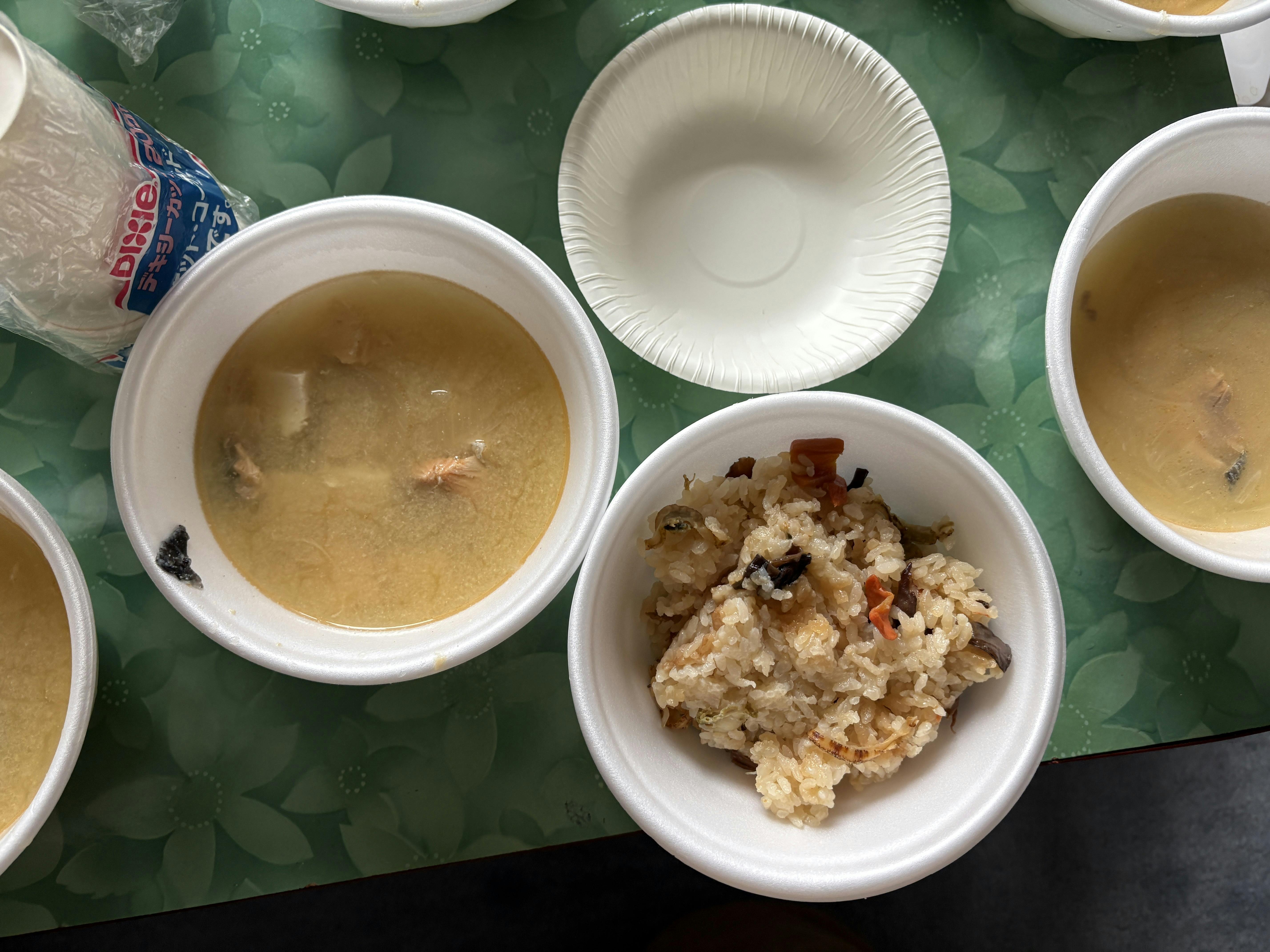 この日のランチは、炊き込みご飯とサクラマスの汁。佐々木家のみなさんがたっくさん用意してくださり、もりもりに器に乗せてしまいました(^0^;)
