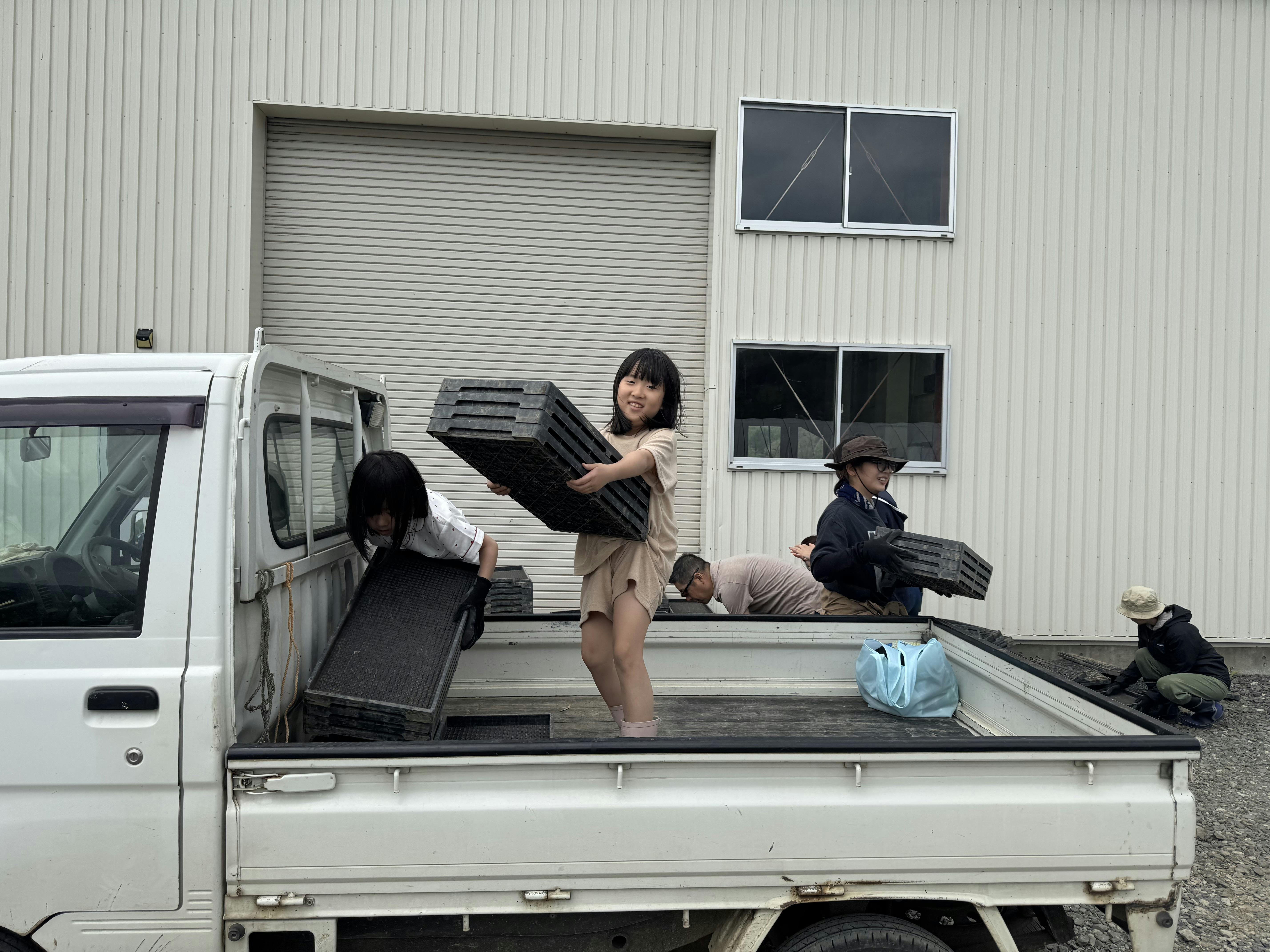 みんなで協力してひとつずつ苗をせっせとトラクターに乗せていきます。床土づくりの時よりも1〜2キロ重さが増え、水分も含んでいるため意外と体力を使いました。