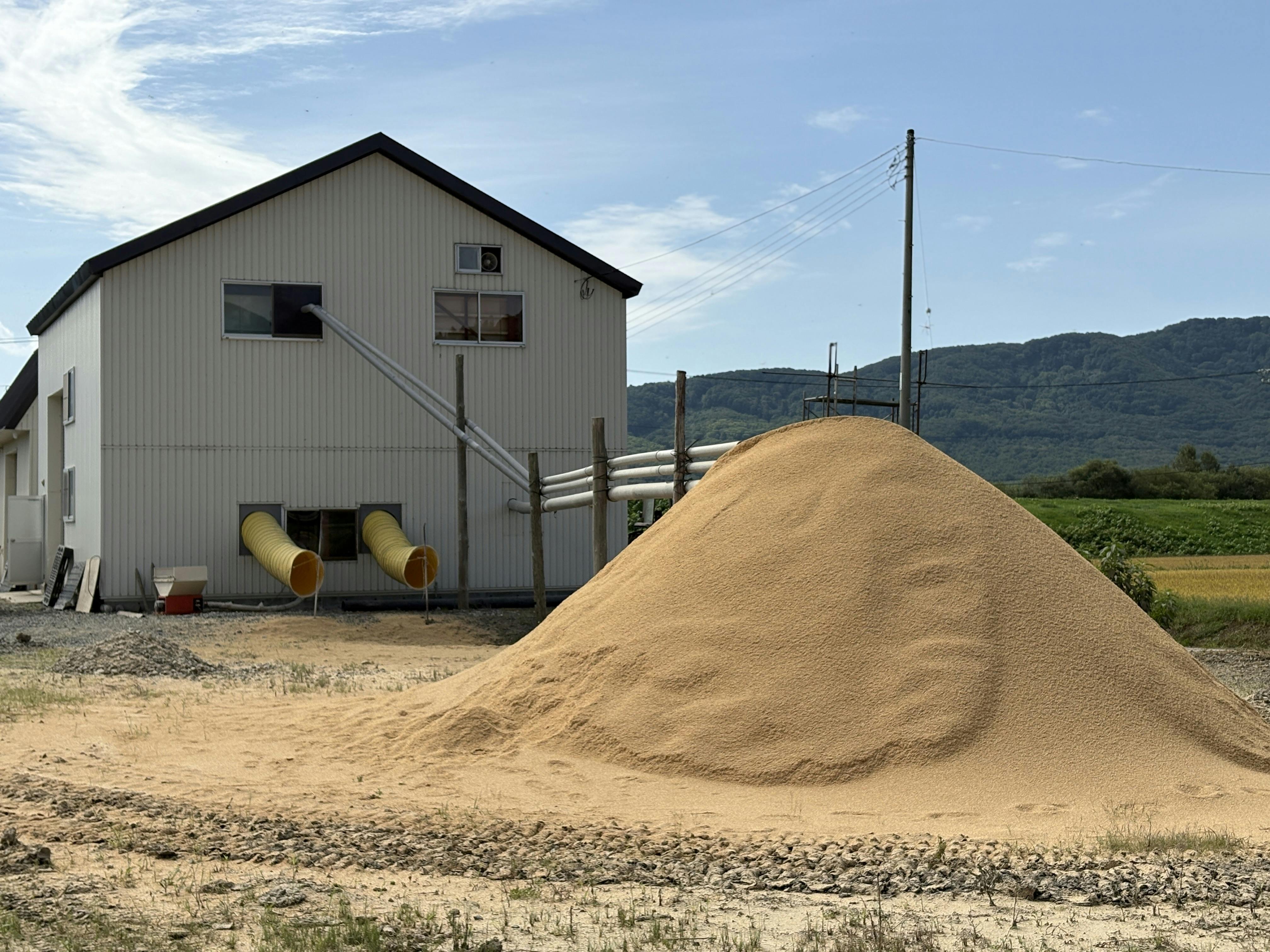 お米からとられた籾殻は外に山になって積まれていきます。ふかふかできもちよさそ〜と思いますが、注意です!!