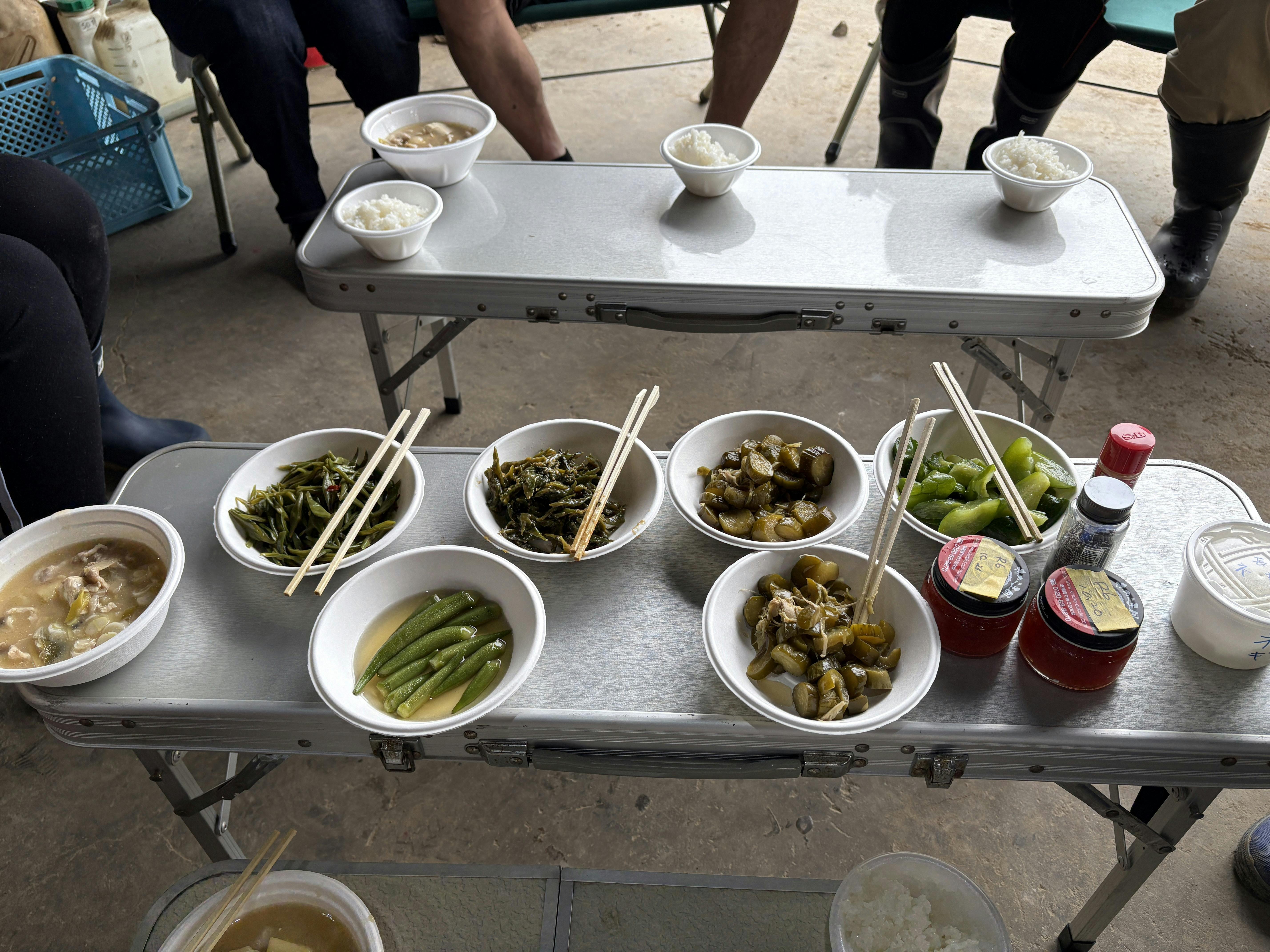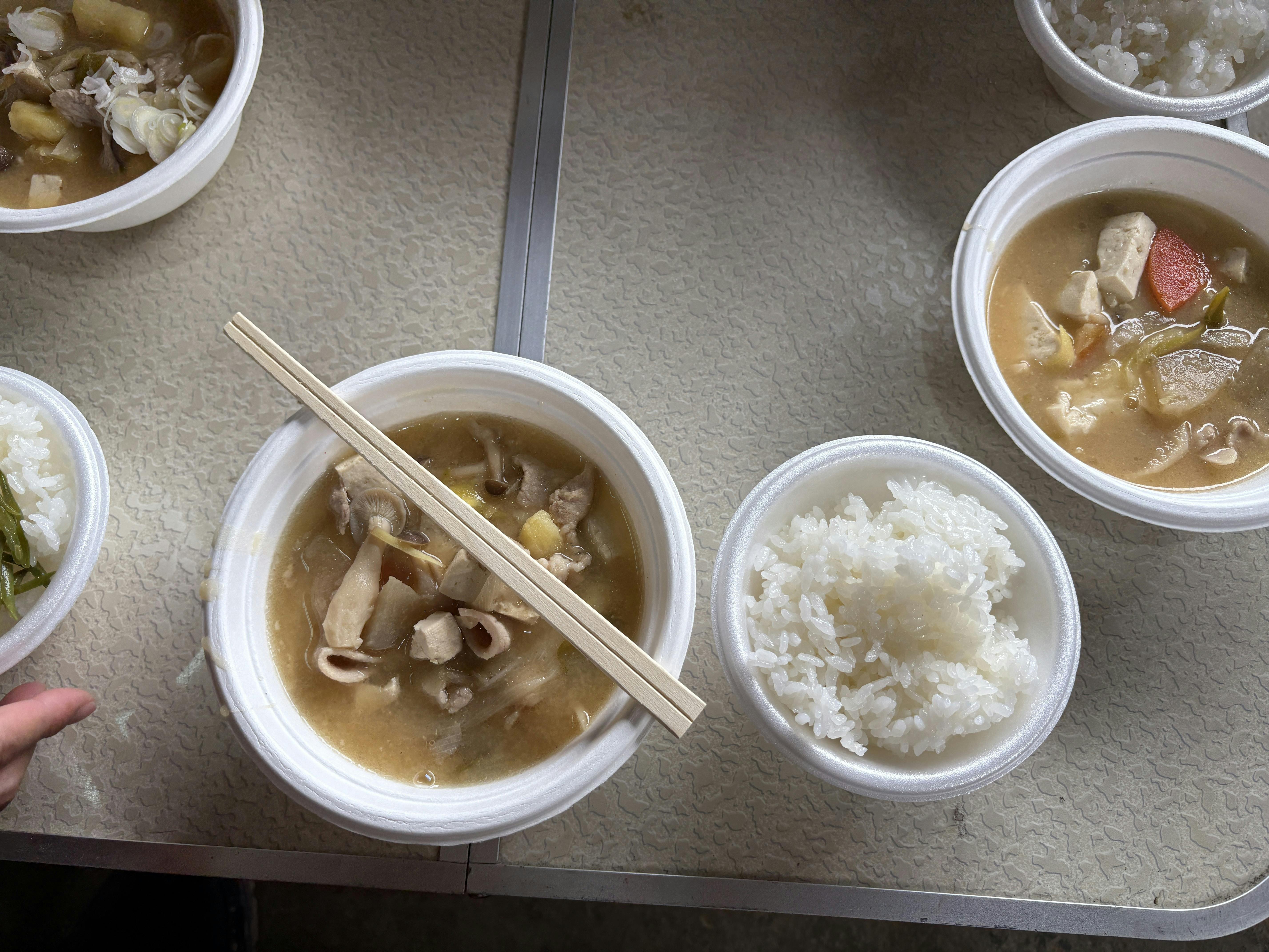 お昼になったら新米のゆめぴりかと種類豊富なごはんのお供、具だくさんの豚汁をいただきました!