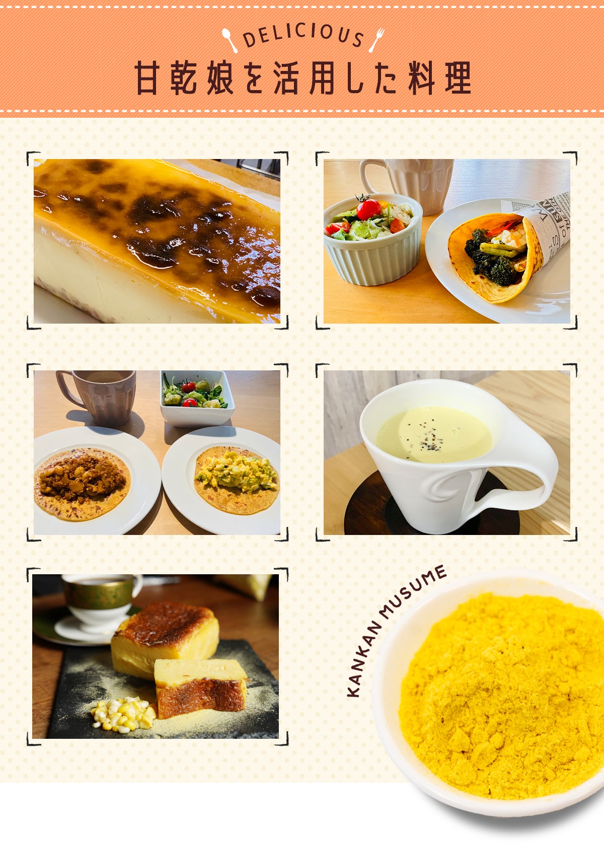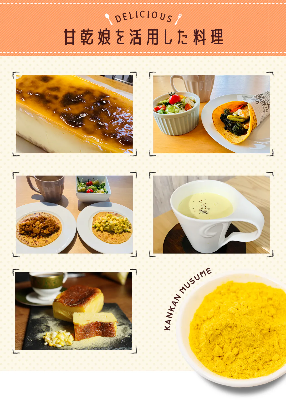 例えば、甘乾娘に、塩と牛乳を混ぜるだけで濃厚なコーンスープが出来上がったり、ケーキやお菓子に混ぜるだけで、濃厚なトウモロコシの味わいがお口に広がります。