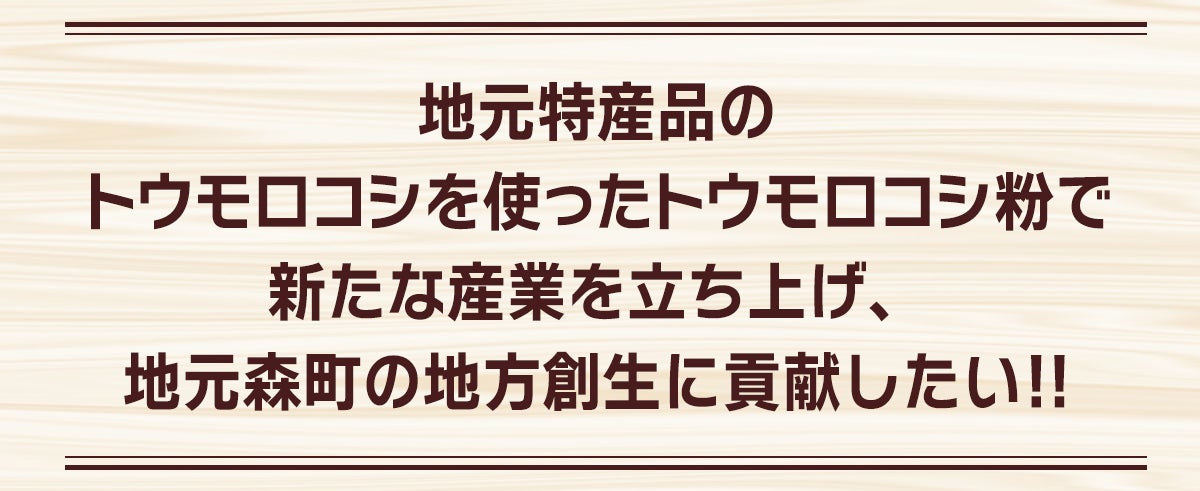 地域の農家が収穫したトウモロコシを、製粉し、商品化し、全国の皆さんに届けることで、地元の雇用創出や地域経済の活性化に向けた大きな一歩を踏み出したいと考えています。