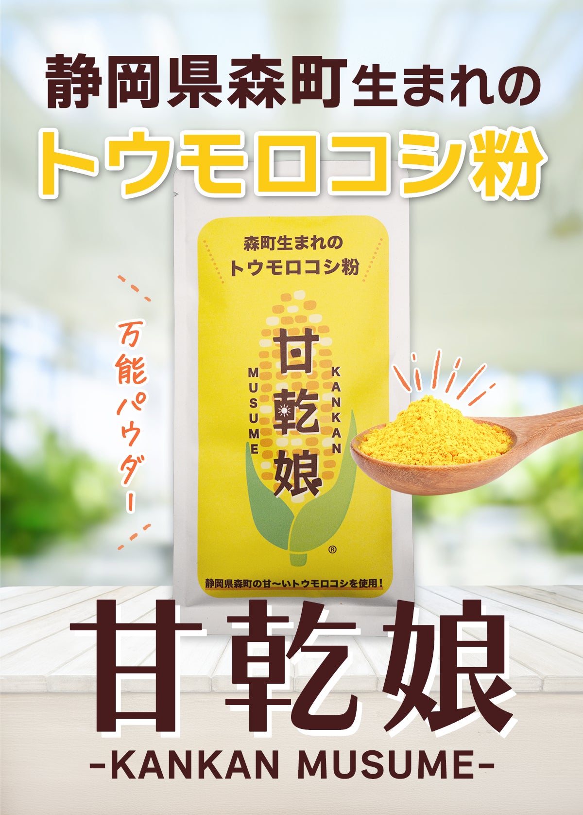 その想いを胸に開発されたのが、静岡県森町産のトウモロコシ(スイートコーン)を100%使用したトウモロコシ粉『甘乾娘』です。