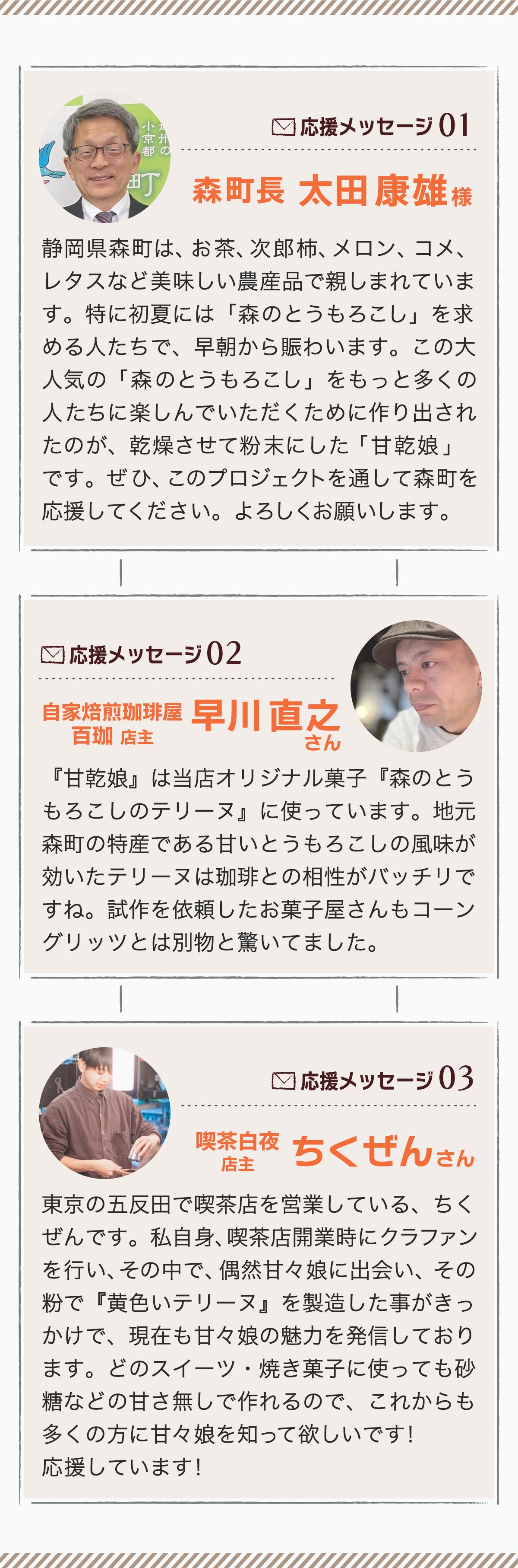 また、「甘乾娘」を通じて、静岡県森町についても認知していただき、地元森町に遊びに来てもらえる人が増えるように、トウモロコシの収穫体験や食のイベントを開催していきたいと思っております。