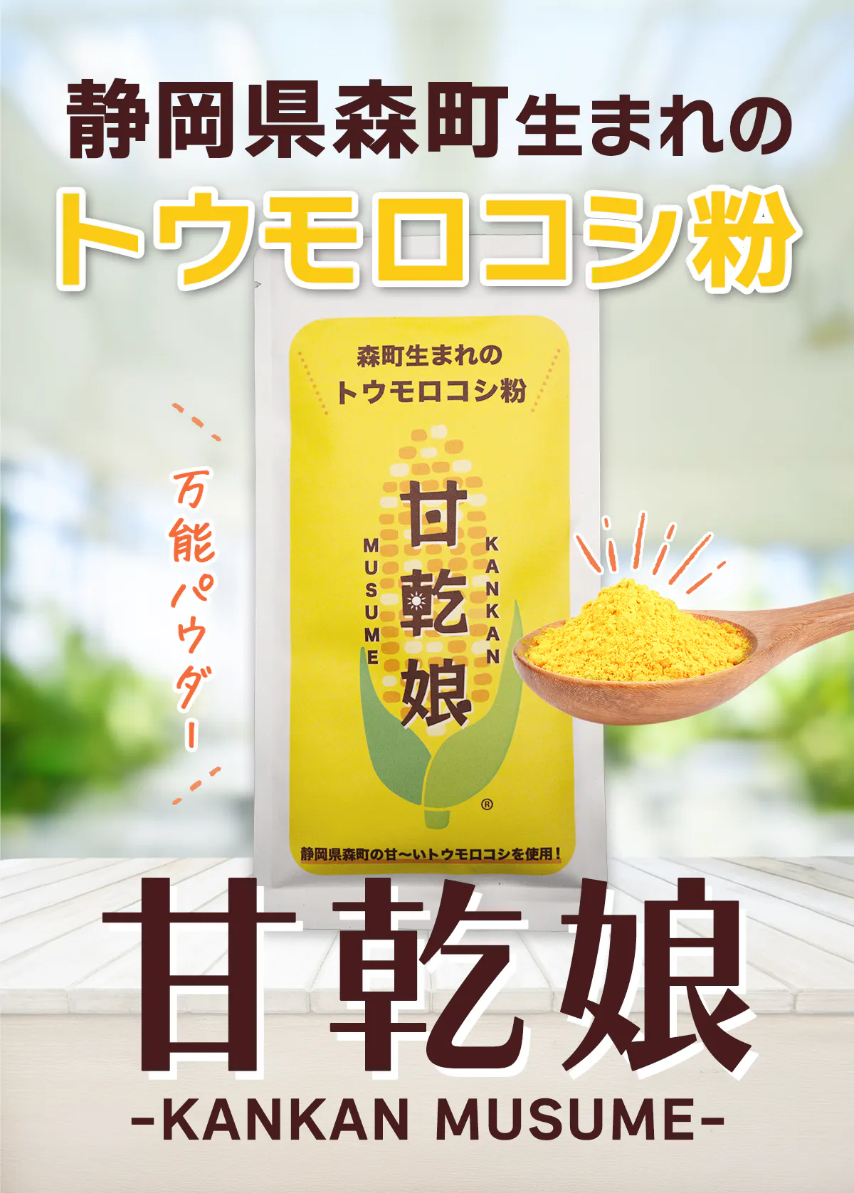 甘乾娘とは、静岡県森町でとれたトウモロコシ(甘々娘)を乾燥、粉末化させたトウモロコシ粉です。