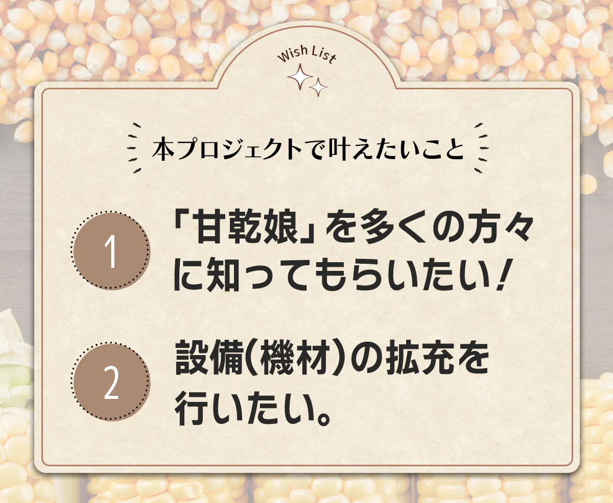 そのため、本クラウドファンディングを通じて、私たちのこだわりにこだわった『甘乾娘』の魅力を知っていただき、『甘乾娘』を多くの方々にお楽しみいただけるよう、ぜひご支援とご声援のほどよろしくお願いいたします。