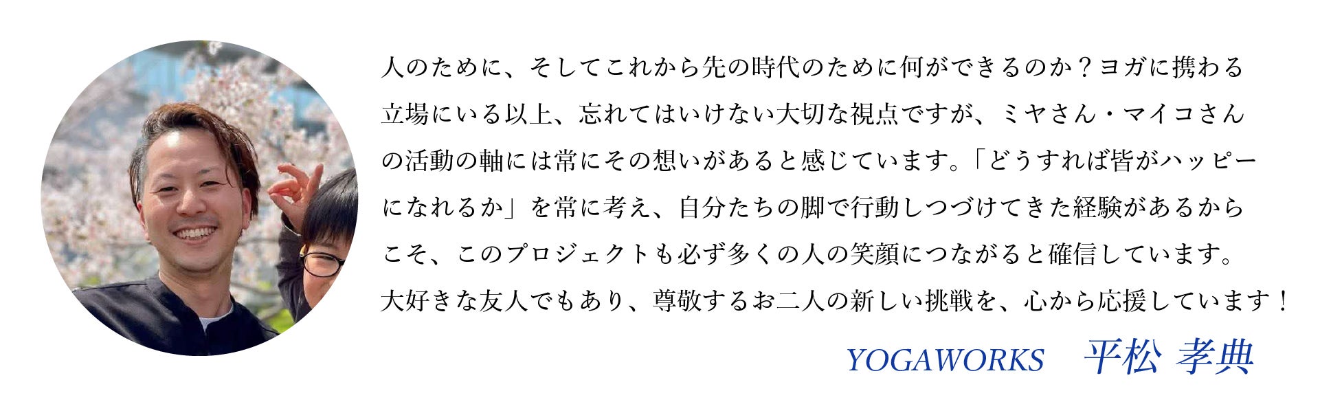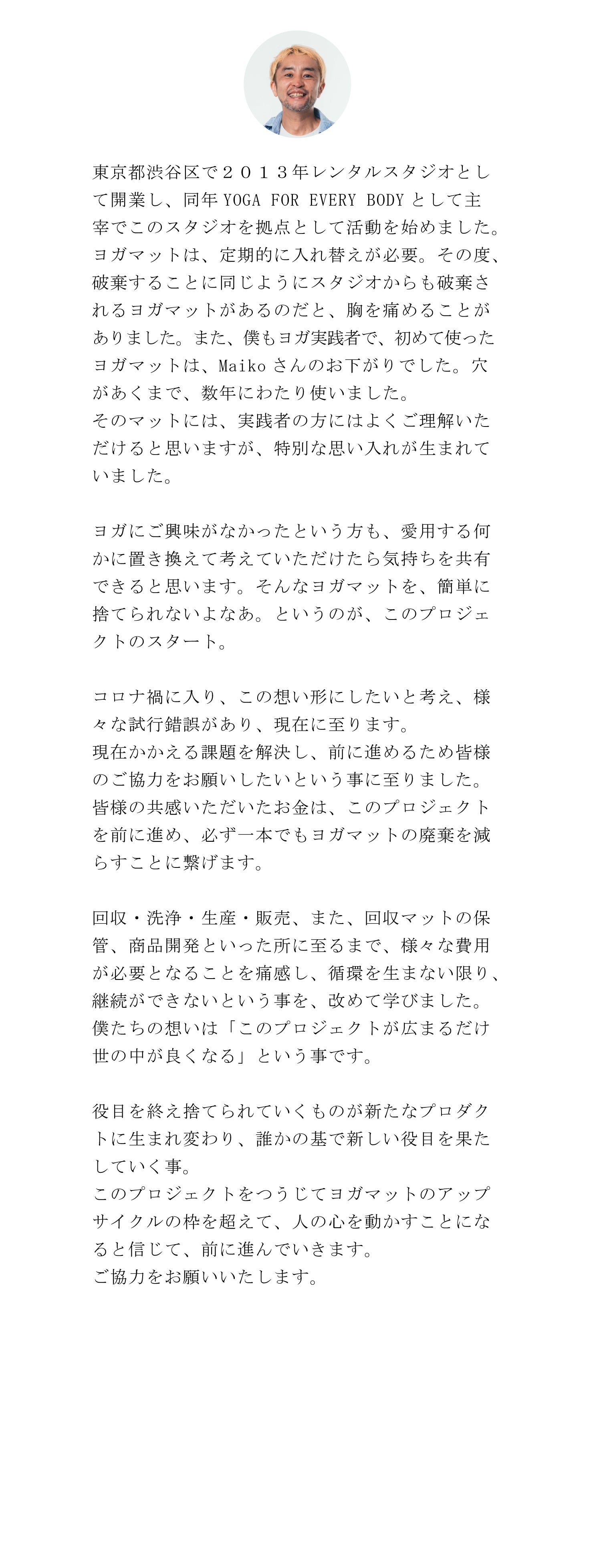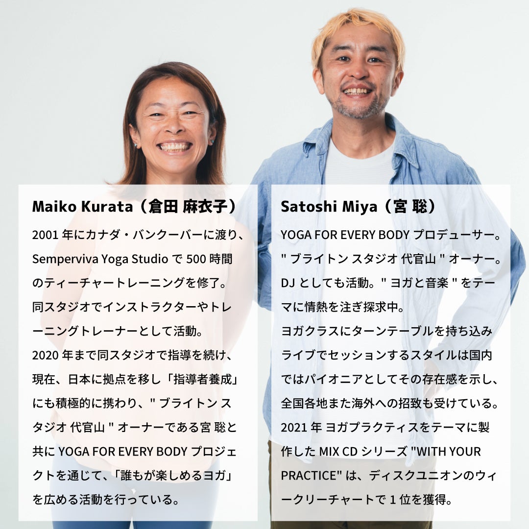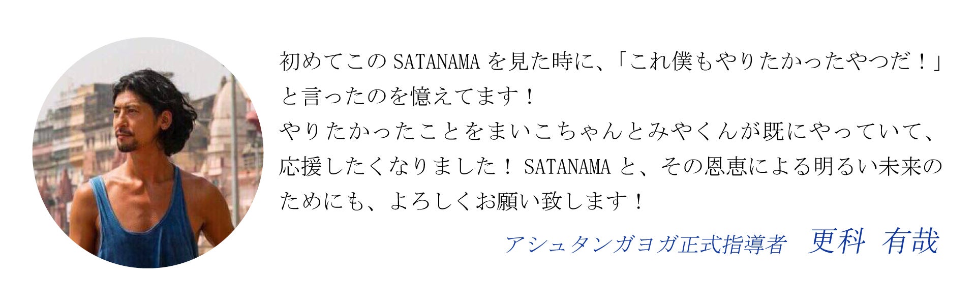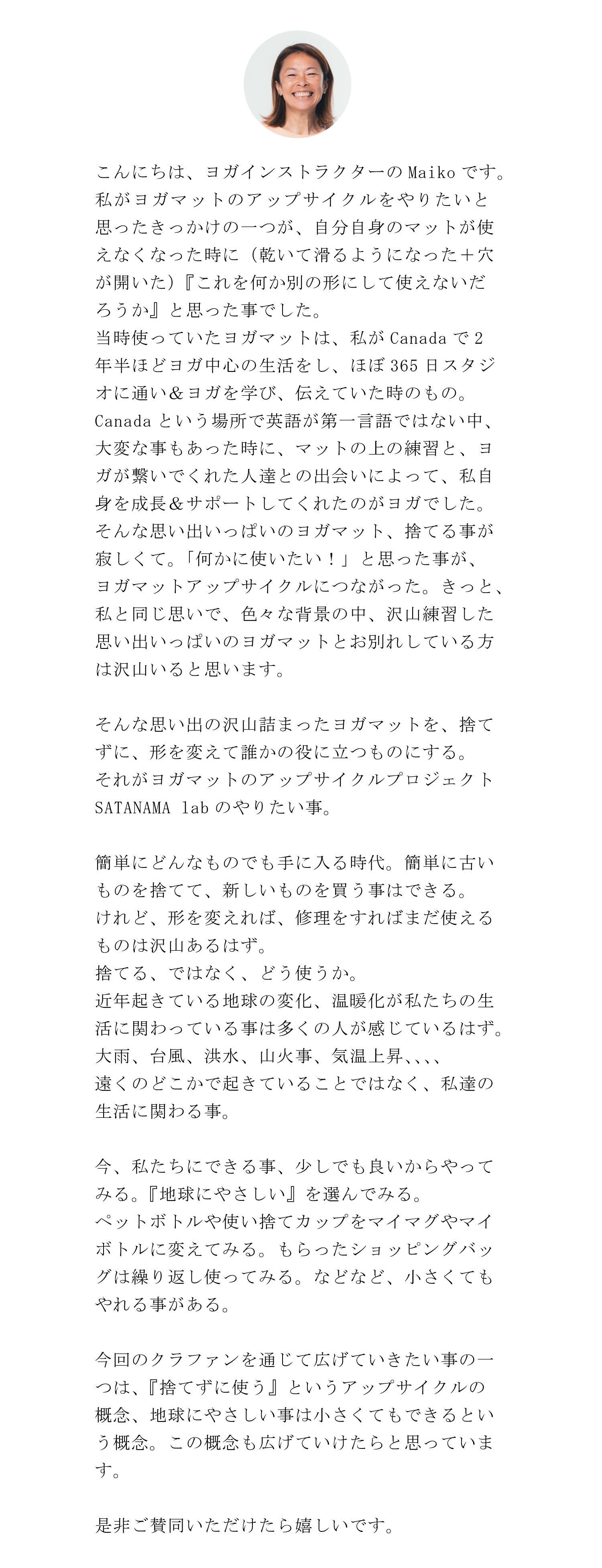 こんにちは!私たちはヨガインストラクターのMaiko KurataとSATANAMAクリエイターのSatoshi Miyaです。「ヨガはみんなのためのもの~YOGA FOR EVERYBODY~」をテーマに、日々ヨガと向き合いながら、多くの方にその魅力を伝えるべく活動しています。今回のクラウドファンディングでは、私たちの新たな挑戦「SATANAMA Lab」を通じて、環境に優しい未来づくりへの一歩を踏み出します!