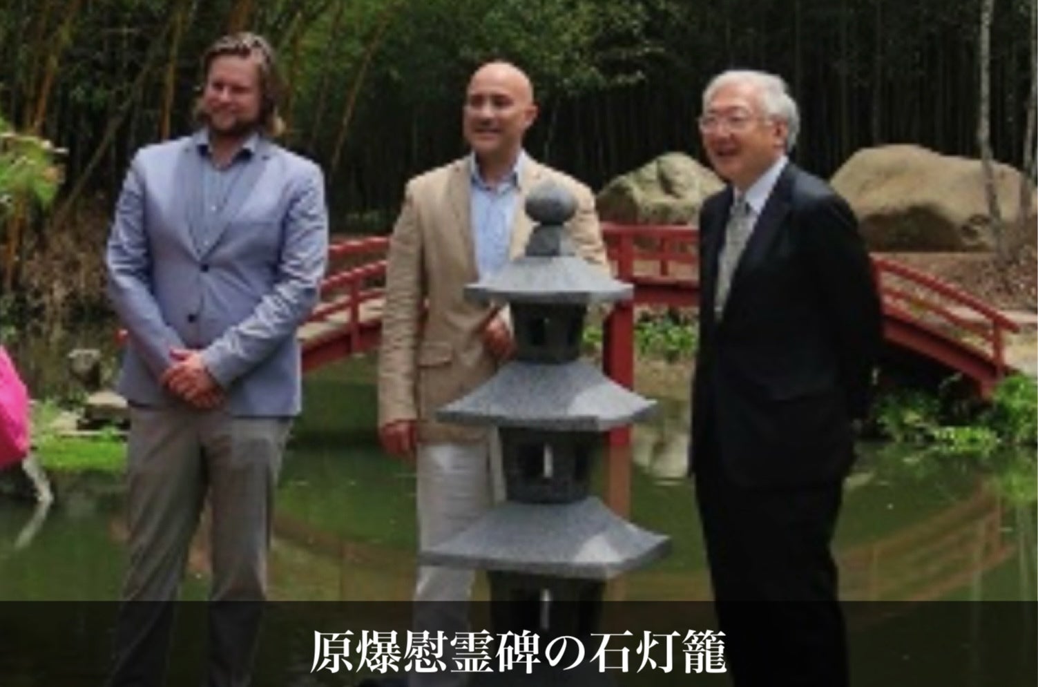この日本庭園には、2022年、コスタリカ帰国留学生会(我が国文部科学省国費留学帰国留学生)のエリック=ブレネス会長により発案され、著名な石工である元山尚人氏の協力のもと建立された石灯籠があります。この石灯籠は広島原爆で犠牲になった方々のための慰霊碑であり、鎮魂の意味が込められています。