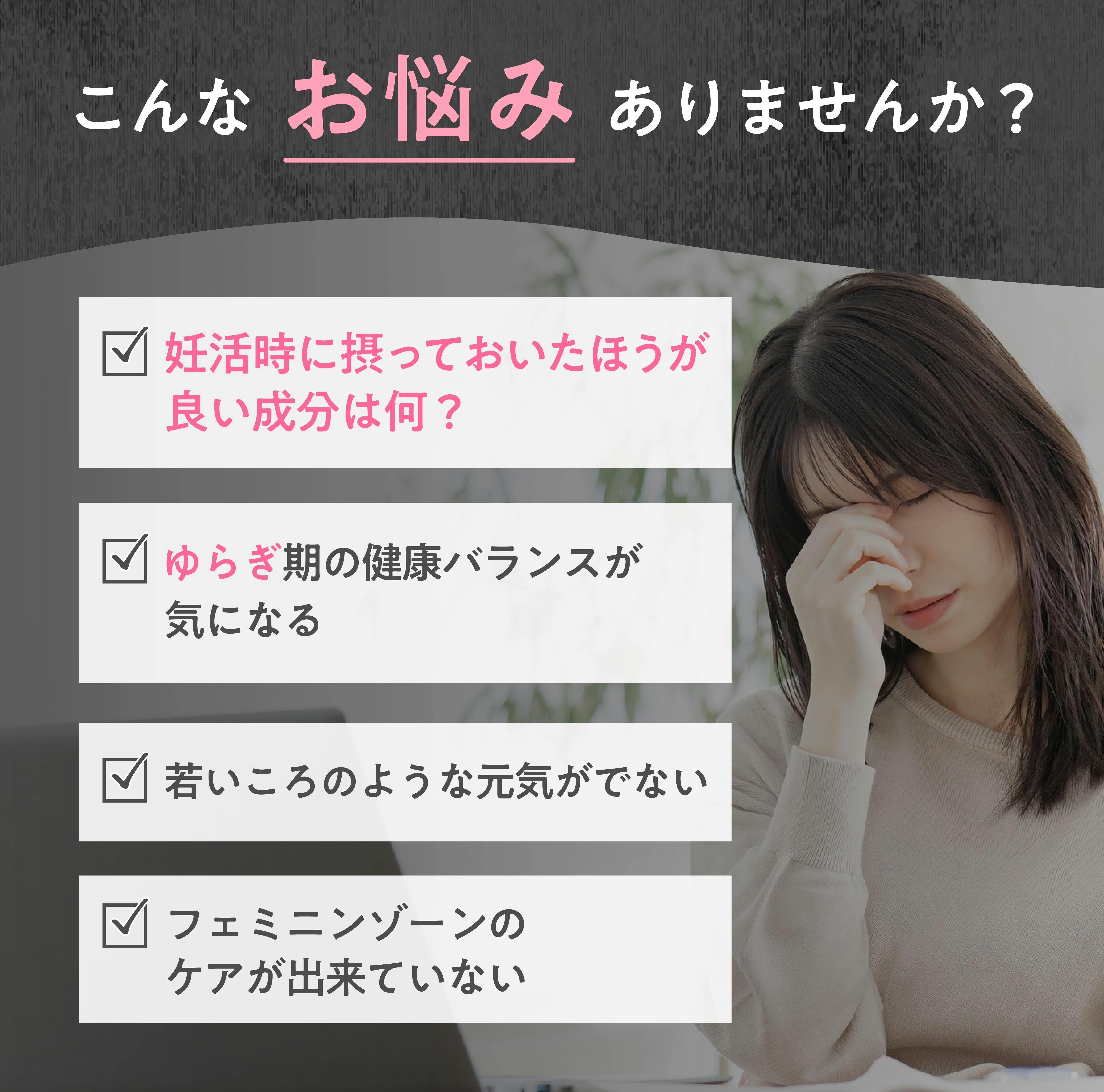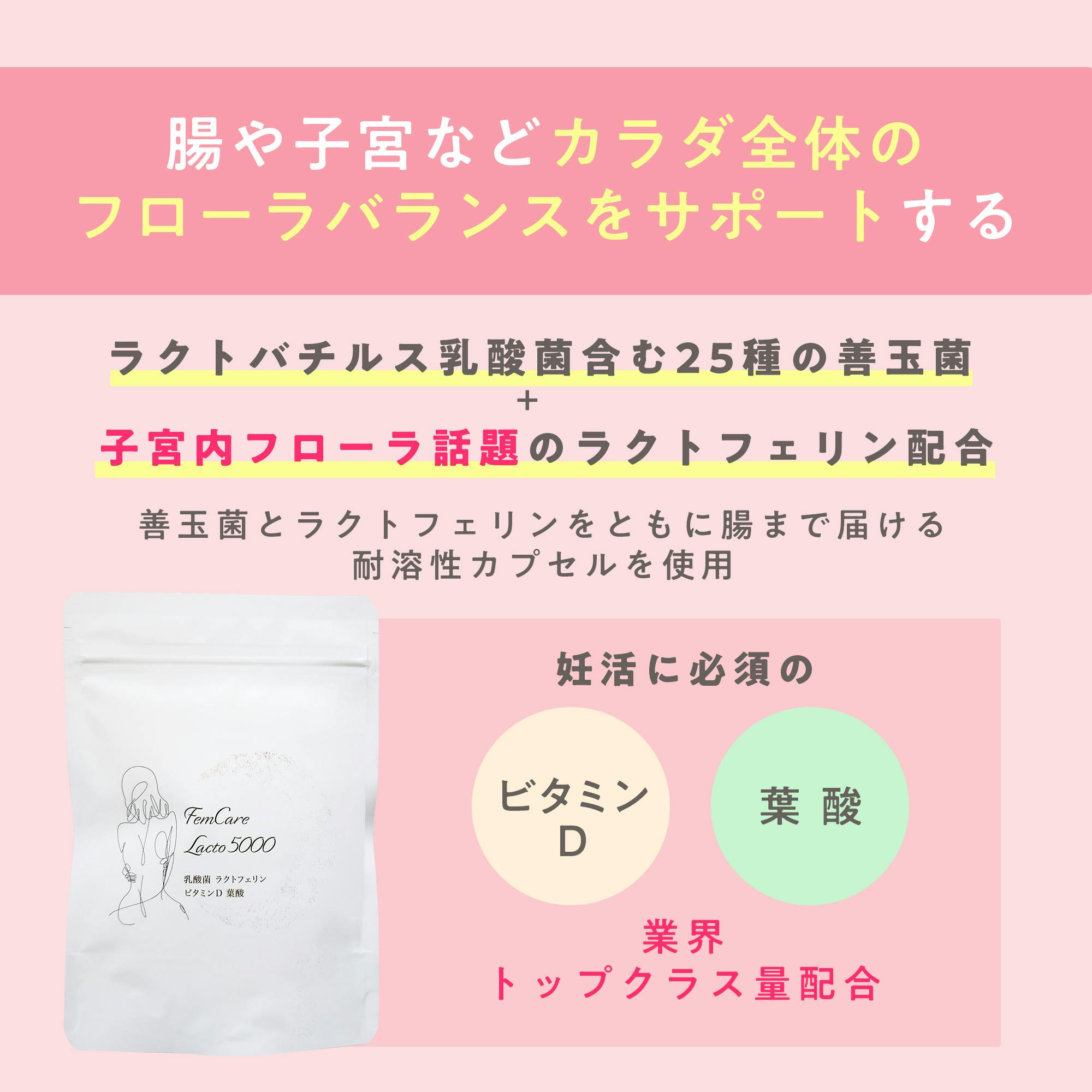 女性の体にとって重要な腸内フローラや子宮内フローラのバランスを整える善玉菌を5000億個以上、その他ビタミンDや葉酸などは妊活に必須とされる量いっぱいに含まれているサプリメントです。フローラバランスを整え、必須ビタミンを摂取することで若々しさの維持、抗う力をアップし、妊娠しやすい体づくりも助けてくれます。