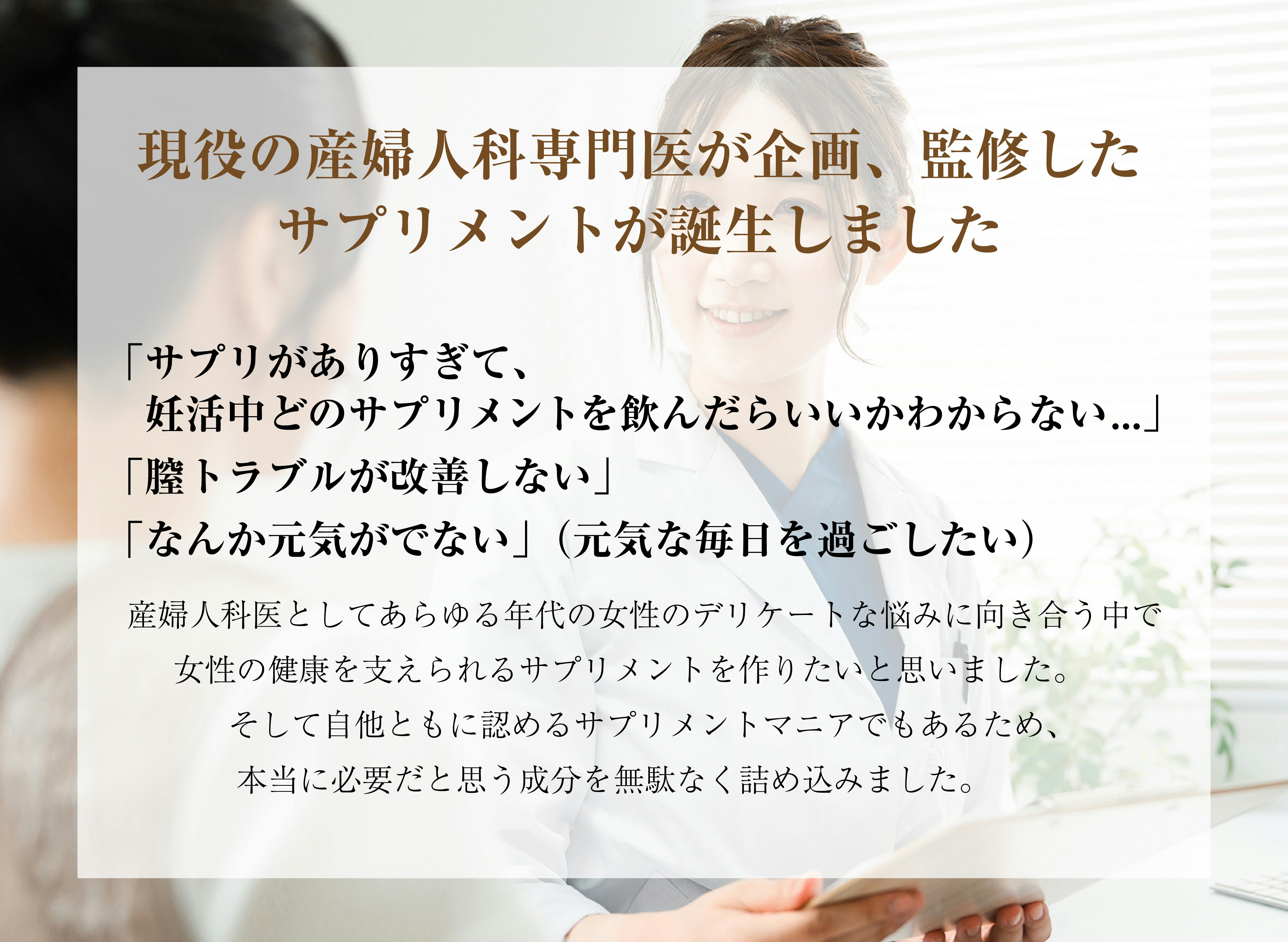 総じてホルモンバランスの乱れや更年期、不妊に悩む女性たちが医学的根拠のない色々な情報に翻弄されている姿を多々目にしてきました。あれがいい、これもいいらしい、ではなく「これだけでいい」、そして医師が監修した信頼できるサプリメントがあればお悩みに寄り添うことができるのでは、と思い真剣に本当に必要なものだけを詰め込んだサプリメントを製作することにしました。大学病院所属であることもあり、身元を明かすことができないため、完全に一人きりでサプリメント製作会社に打診するところから始めました。手探りで色々な方のお力を借りて何とかここまできましたので、どうにか一人でも多くの女性の手元に本物のサプリメントが届いて欲しいと切に願っております。