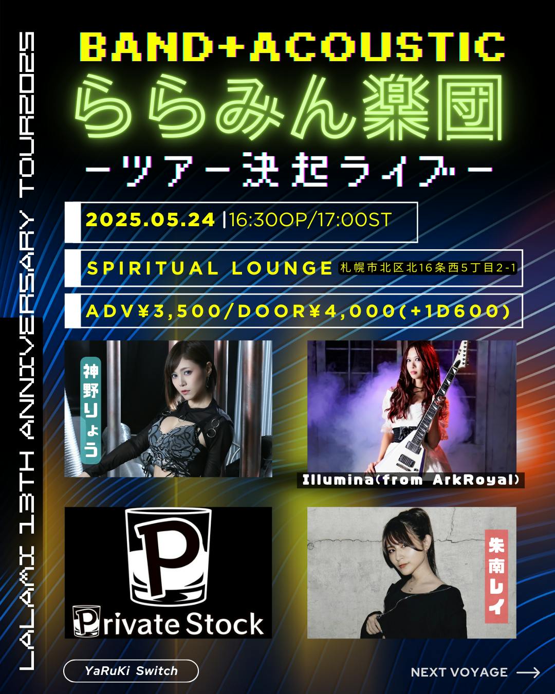 Illumina(ArkRoyal)ー実は!なごさん加入前のららみん楽団サポートメンバーとして長く助けてくれていたギタリストです。ある時3マンライブでアークとららみん楽団の対バンをした時。彼女はサポートとメインのバンドの一人二役だったのですが、アークロイヤルでバンドのフロントに立つ姿がすごくかっこよくて、これはサポートの時に生かしきれない良さだ!私ももっと成長しているみーのかっこ良さと戦えると確信した時にこそまた同じステージに立ちたい!と思ったんです。同じくフロントに立つスターでライバルです。今回はソロでの登場。来てくれてすごく嬉しい!翌日はアークロイヤルのツアーファイナルもあります!