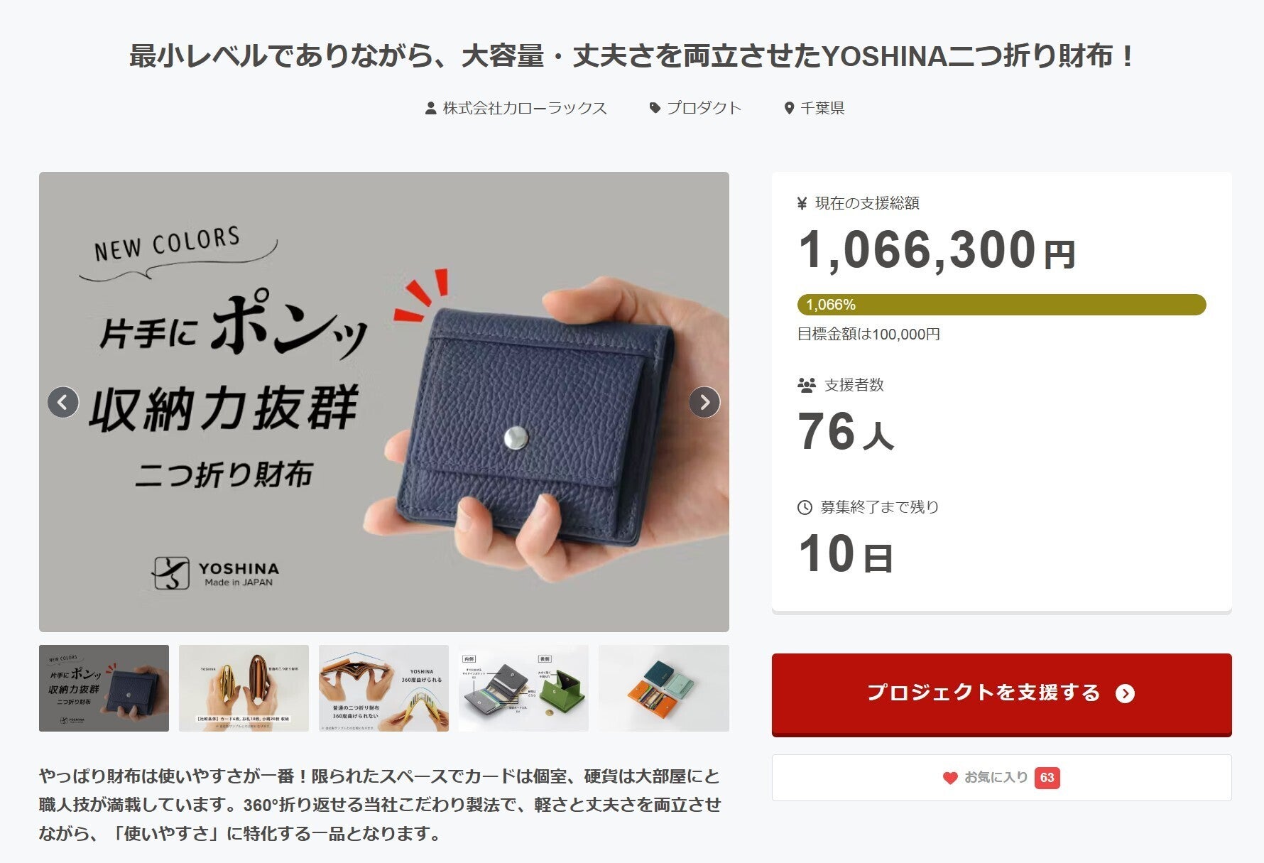 皆さまこんにちは。このたびは、弊社製品へのご支援をいただき、誠にありがとうございました。皆様からいただいた貴重な資金のおかげで、新製品の開発および製造に専念することができました。改めて心より御礼申し上げます。本日は、弊社独自の特許意匠権を取得したLZIP長財布についてご案内申し上げます。ビジネスシーンで静かに存在感を放つ国産手染めレザーと、色移りしにくく汚れに強い国産豚革を組み合わせて使用するほか、社内一貫生産にこだわる強みを活かし、ライフスタイルに合わせて「カード派」または「仕分け派」を自由にお選びいただけます。また、キャッシュレス時代に伴うスキミング対策として、オプションの「スキミング防止シート追加」をご用意しております。さらに今回はmachi-ya限定で、追加時に「全面スキミング防止仕様」による安心感、または「部分スキミング防止仕様」による利便性からお選びいただけますので、ぜひプロジェクトページをご覧いただけますと幸いです。-------------------------------------------------------------------------------------------------------開始日:2026年4月09日(木) 12:00コンパクト”だけ”ではない。縦入れカードもつっかえず収まる特別設計Lジップ財布!https://camp-fire.jp/projects/933866/-------------------------------------------------------------------------------------------------------YOSHINA スタッフ 一同