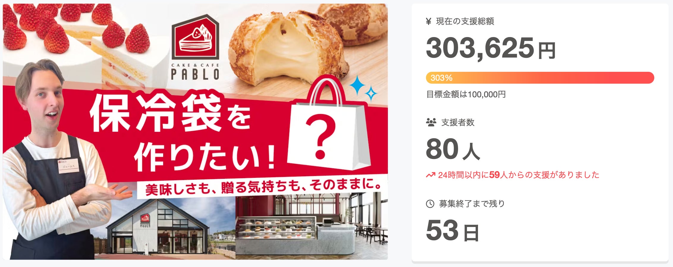 ここまでたくさんの応援・シェア・ご支援、誠にありがとうございます!おかげさまで、・支援者様 159人・達成率 656%という多くの応援をいただくことができました!皆さま一人ひとりの温かい想いが、私たちの大きな力になっています。今回私たちは、「大切な人への贈り物として、最高の状態でPABLOのスイーツを届けたい」そんな想いから安心して持ち運べるオリジナル保冷袋を作るためのプロジェクトに挑戦しています。残り1週間、ラストスパートです!「気になっていたけど、まだ支援できていなかった…」という方がいらっしゃいましたら、ぜひこの機会にご参加ください。すでにご支援いただいた皆さまにも、周りにこの活動を伝えていただけたら本当に嬉しいです!最後まで、想いを込めて走り抜けます!どうか引き続き、温かいご支援・応援をどうぞよろしくお願いいたします!