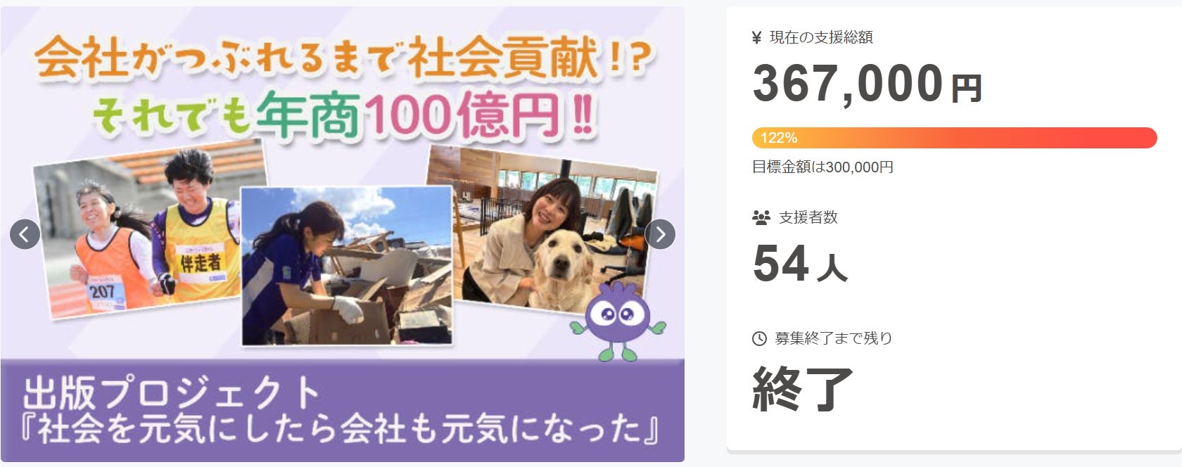 2025/08/22 15:52みなさん、こんにちは!わかさ生活出版チームの吉田です。この度、書籍『社会を元気にしたら会社も元気になった』プロジェクトが、達成率122%で無事ゴールを迎えることができました!応援してくださった54名のみなさま、本当にありがとうございます。今回のクラウドファンディングは、単に本の紹介だけではなく、私たちがこれまで続けてきた社会貢献の歩みや、そこに込めた想いを社会へとつなぐ挑戦でした。私自身も参加する中で、沢山の方から温かい言葉を沢山頂きました。「誰かを元気にすることは、自分たちも元気にする」という気づきを大切にこれからも活動を続けていきます。ご支援いただいた資金は一縁のeye基金に充当します。この基金は、盲導犬育成支援や児童養護施設支援、視覚障がい者支援等様々な活動に役立たせて頂いております。収支は毎年公開していますので、ぜひこちらもご覧ください!わかさ生活 コーポレートサイトリターン発送予定1. 能登の塩セット(能登海洋深層水施設「あくあす能登」)発送予定:2025年9月初旬~順次発送2. ブルブルくん限定Tシャツセット(アトリエやっほぅ‼︎× ブルブルくんコラボ)発送予定:2025年9月初旬~順次発送3. 「ブルーベリーアイ」1年分セット(31粒 × 12袋)発送予定:8月下旬~順次発送このプロジェクトを通じて、支援してくださった方との新しいつながりや、現地での貴重な出会いがたくさん生まれました。皆さまからいただいた応援は、「一緒に社会を良くしたい」という想いの証です。これからも、いただいた想いを力に変えて、活動を続けてまいります! もっと見る