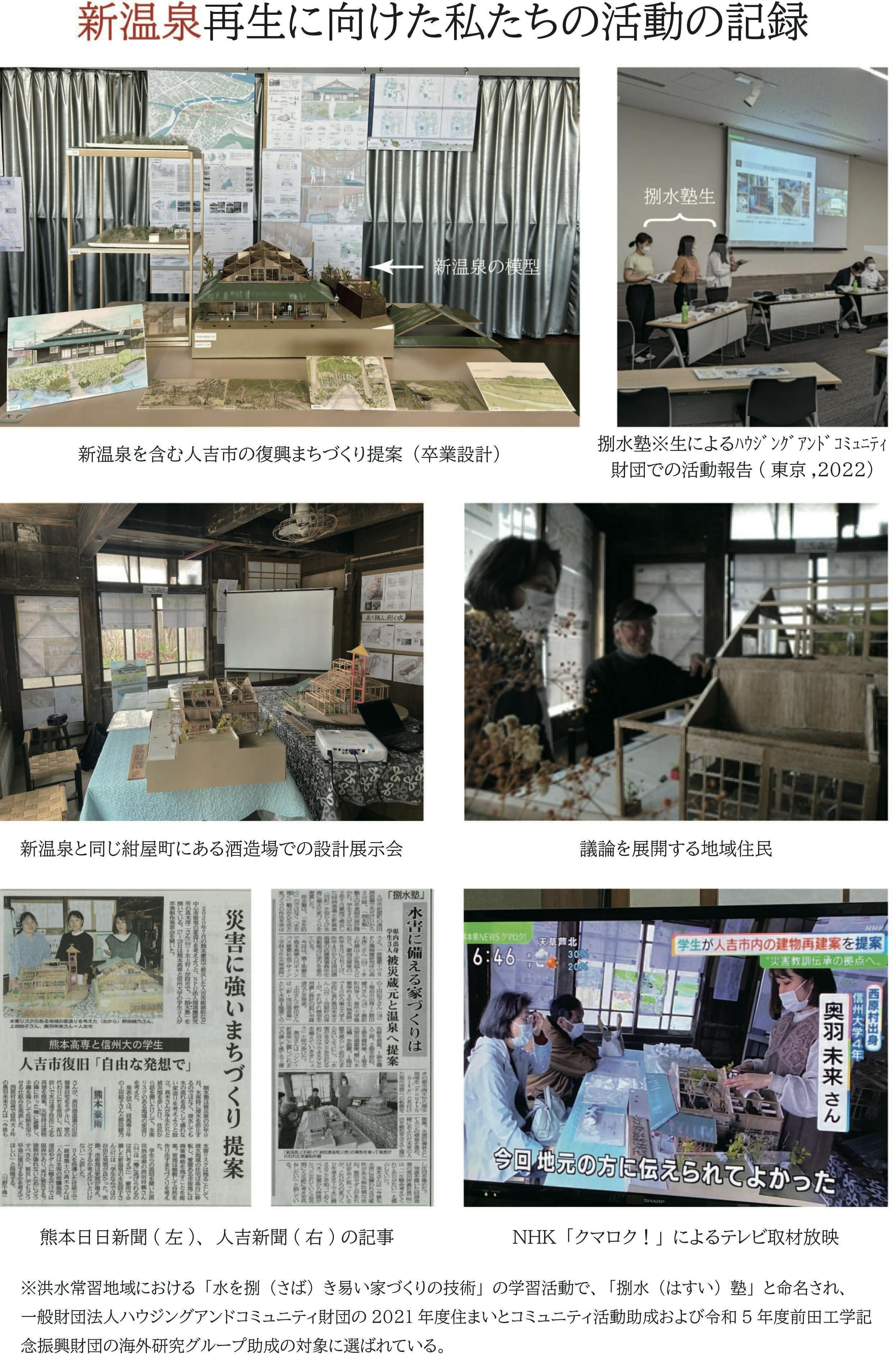 2025/07/18 12:00■お礼まずは、プロジェクトを支援していただきありがとうございます!支援金金額が70万円を突破しました!皆様のおかげです。温かいお言葉、応援が、新温泉再生への大きな励みとなっております。そして、目標の360万円に向けてまだまだ頑張っていきます!水災メモリアルとしての新温泉の再生にご支援よろしくお願いします。■捌水塾について今回、皆さまにご支援いただいた「新温泉クラウドファンディング」は、「捌水塾(はすいじゅく)」が運営を行っています。ところで、「捌水塾」とは一体何なのか、ご存じでしょうか?今回は、その「捌水塾」について、ご紹介させていただきます。「塾」と聞くと、一般的には子供向けの学習塾を思い浮かべる方が多いかもしれません。実際、人吉で活動しているとき、近隣の方々から「勉強ば教えてくれるとね?子供を習わせたいんだけど」と尋ねられることもしばしばありました。間違いではありません。しかし、捌水塾では「水捌けの良い家や、水捌けの良い町や村」を作る技術(知恵)を学ぶ学習活動を行っています。「捌水塾」→捌水→水捌→水捌け(みずはけ)というのが由来で「捌水塾」は誕生しました。属するもの皆が塾生!先生は、大工の棟梁や石工、米農家のおじさんなどの実務者、時には球磨川を泳ぐ魚たち!令和2年7月に発生した豪雨災害後から新温泉を含む球磨川流域、トンレサップおよびメコン川流域(カンボジア)を対象として学生を中心に設計・研究活動を行ってきました。令和3年度は、新温泉と同じ紺屋町にある築94年の木造住宅兼酒造場である「渕田酒造場」を活動拠点としていました。 活動拠点:渕田酒造場■これまでの活動令和2年 9月 人吉市紺屋町にある新温泉とその界隈を調査し模型を制作人吉市街地模型 1/40令和3年 8月 捌水塾講座&実技講習〈水を捌く建築技法を問う〉 開催 9月 出張捌水塾 in大柿地区(稲刈りに参加) 令和4年 2月 出張捌水塾 in 甲佐 3月 捌水塾中間報告会 捌水塾卒業制作展捌水塾卒業制作展で発表する塾生 令和5年 9月 紅河(ベトナム)・メコン川(カンボジア)フィールドワーク令和6年 8月 ・11月 メコン川、トンレサップ川(カンボジア)フィールドワーク村長にヒアリング調査する塾生たち in カンボジア令和7年 現在 新温泉クラウドファンディング令和3年度は、一般財団法人ハウジングアンドコミュニティ財団の2021年度住まいとコミュニティ活動助成、令和5年度は、前田工学記念振興財団の海外グループ助成に選ばれ活動してきています。以上の活動の中で私たちは、水を「防ぐ」のではなく、水を「捌く(さばく)」建築技法を磨き続けています。支援頂いた皆様には、【 捌水塾の活動をまとめたご報告書】を送らせていただきます。新温泉の再生や歴史的建築の利活用、カンボジアでのフィールドワークなど、人吉とカンボジアをつなぐ挑戦の軌跡を一冊にまとめています。これ一冊であなたも水害への備えの達人です!ぜひご覧ください。読んでいただきありがとうございました。以上、今回は捌水塾についての説明でした。次回からは活動内容について書いていく予定です!引き続き、新温泉クラウドファンディングのご支援をよろしくお願い致します! もっと見る