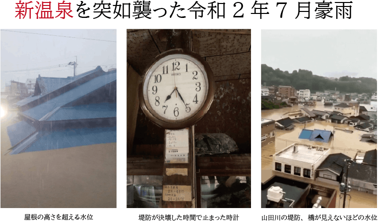 球磨川は恵みを与えてくれる存在であると同時に、古くから「暴れ川」として畏れられる存在でもありました。新温泉も開業以来、台風や豪雨による水害で被災するとともに、その記憶を今に留めています。