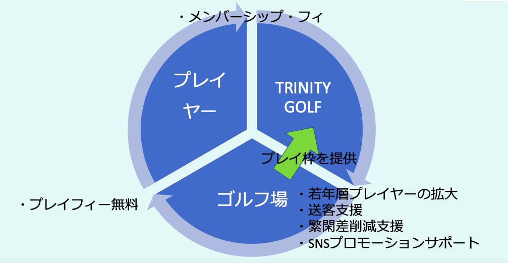 「20代・30代の方々にもっとゴルフをプレイして欲しい」「2000コースを超える美しい日本のゴルフ場の稼働率をもっとあげたい」これが私どもが提供するゴルフラウンドのサブスクリプションサービス「トリニティゴルフ」の目標です。私どもは「トリニティゴルフ」を通じて新しいゴルフのプレイスタイルを世の中に普及して参ります。高額なレジャーのイメージが強いゴルフをもっと身近なレジャーにしていく事で、若年層を中心としたプレイヤーの拡大を目指していきます。併せて「トリニティゴルフ」のメンバーのみなさまにSNS上でゴルフ場を告知して頂くことで、ゴルフ場のセールスポイントを訴求し、稼働率向上にも寄与したいと考えています。