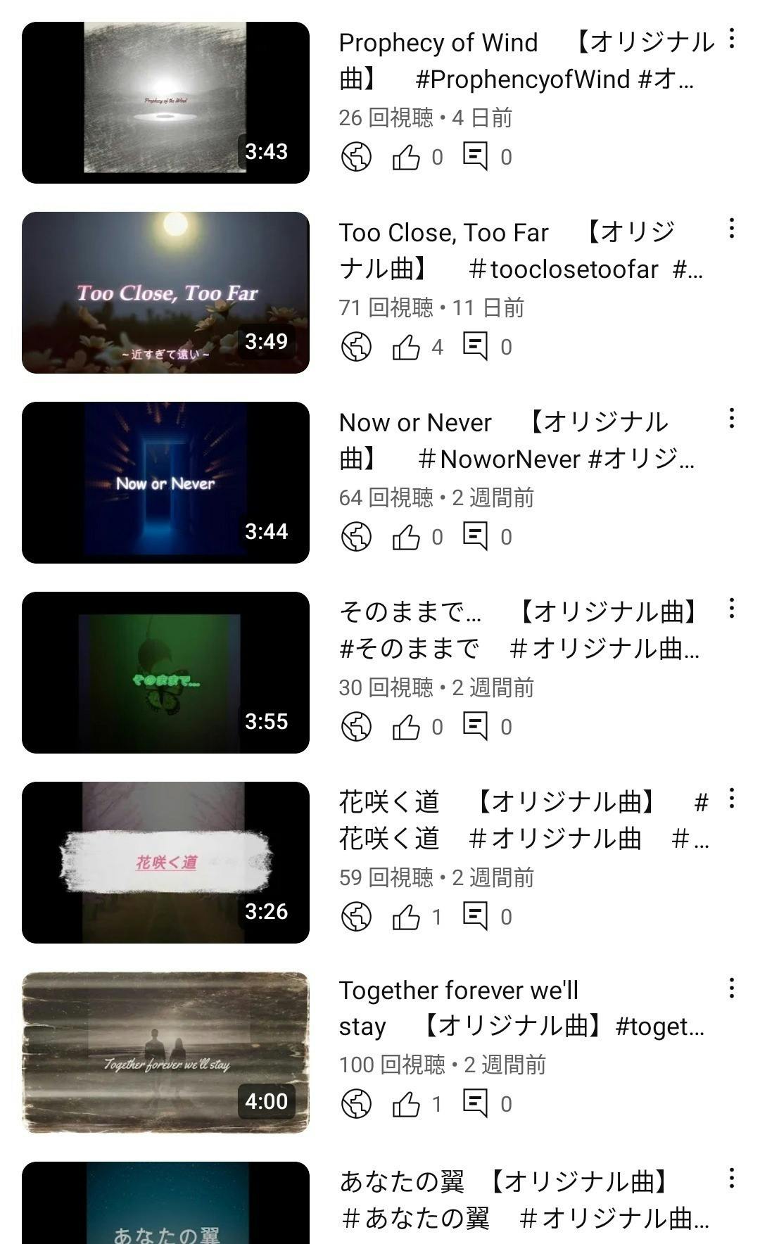 今現在、YouTubeとTiktokへ、歌詞の文字起こし動画の投稿を行っています。動画投稿されている曲は、自作曲の1部で、動画投稿済の曲も含め、あらゆるストリーミングサービスへの楽曲配信をしております(例、Spotify、AmazonMusic、YouTubeMusic、AppleMusic等など)。特にTiktokでは、多くの方々に応援していただいております。楽曲制作のスキルを磨くため、現在も日々作曲の創作を活動を行っております。