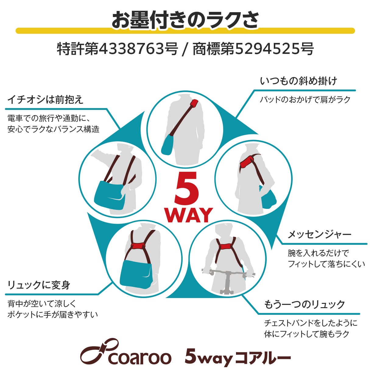 コアルーバッグ共通の5wayへの変身はこちらのVTRをご覧ください。各商品には、掛け方をイラスト付きで解説した取説がついており、取説には掛け方動画にアクセスできるQRコードもご案内しています。