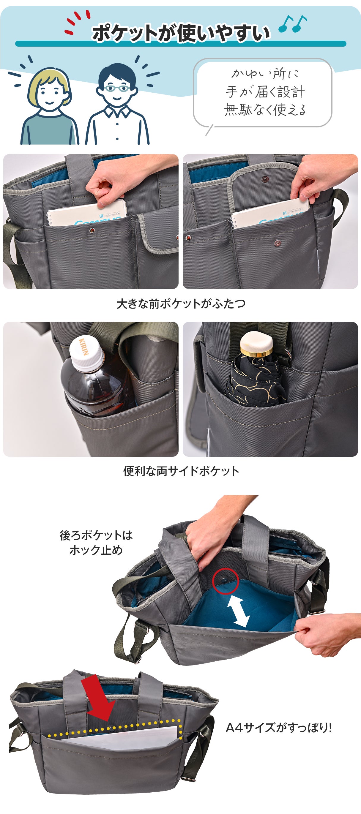 そして大きいからこそポケットの設計は重要になります。今までのコアルーバッグも収納へのこだわりは評判でしたので、今回の「ウィンク」も使いやすいポケットを目指しました。