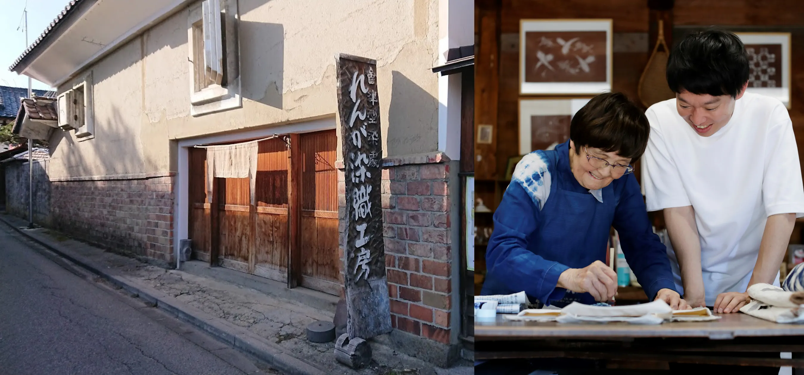 左:蔵を改装した工房、右:代表の冠木昭子先生と私