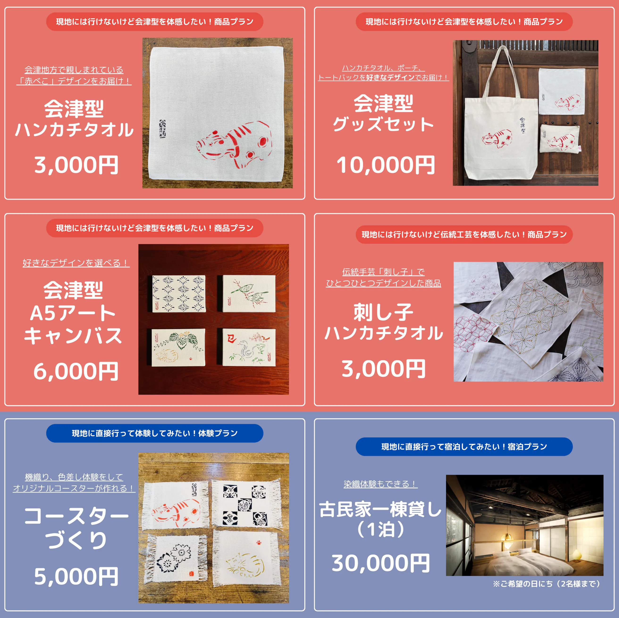 会津に行ってみたいけれど、なかなか難しい方には、ぜひ商品プランをご検討ください。こちらのプランでは、お好みの型紙を選んでいただき、作家が色さしをした会津型商品をお届けします。