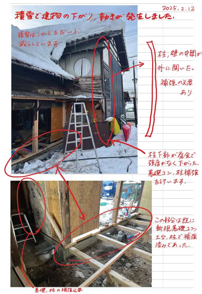 そして、、、雪の加重により建物の壁が曲がってしまう事態になってしまいました。。