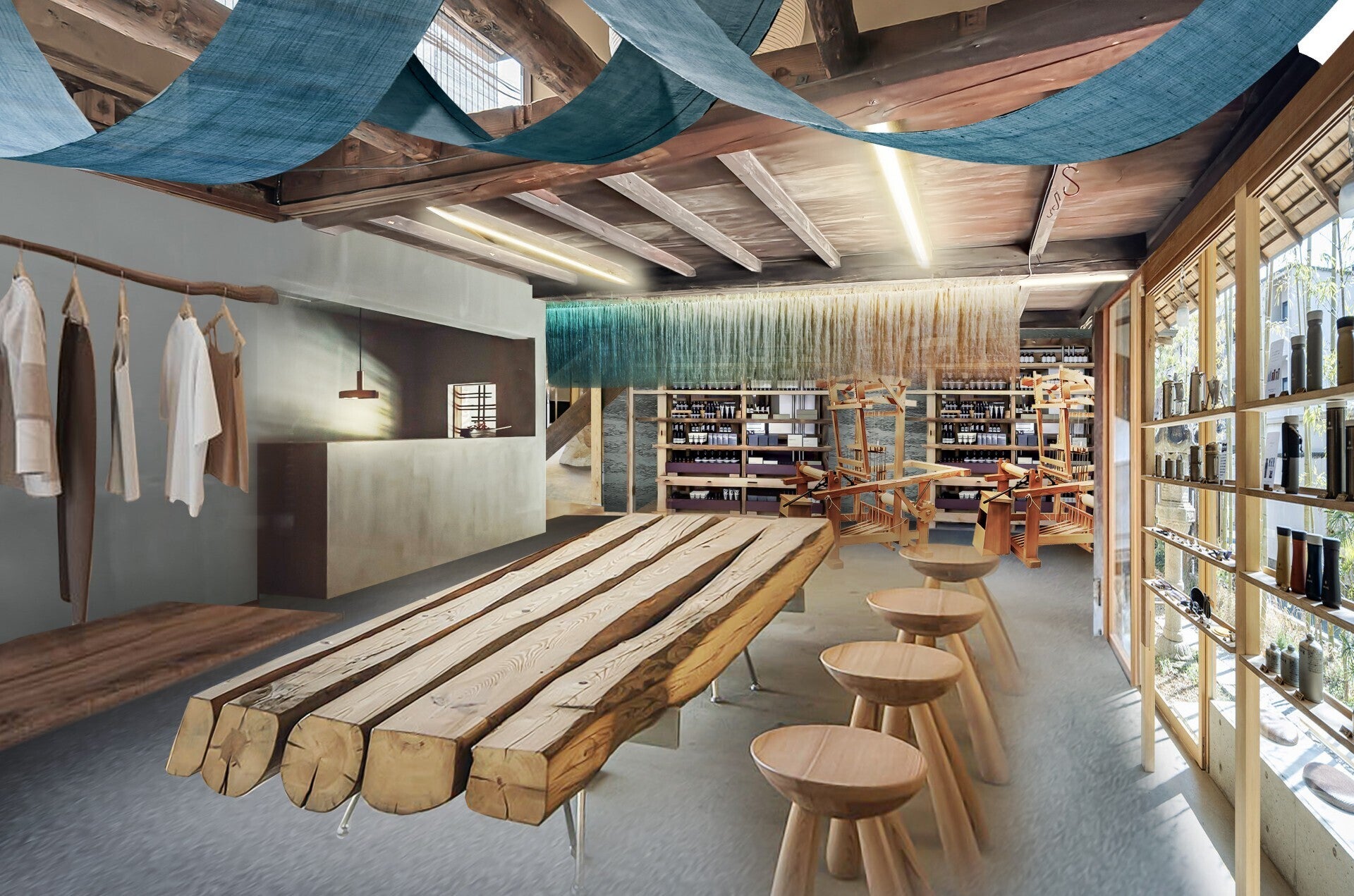 店内には機織り機をはじめとする機材が置いてあり、織り子が作業する様子を間近で見ることができます。普段はあまり気にすることのない制作過程を知ってもらえると嬉しいです。