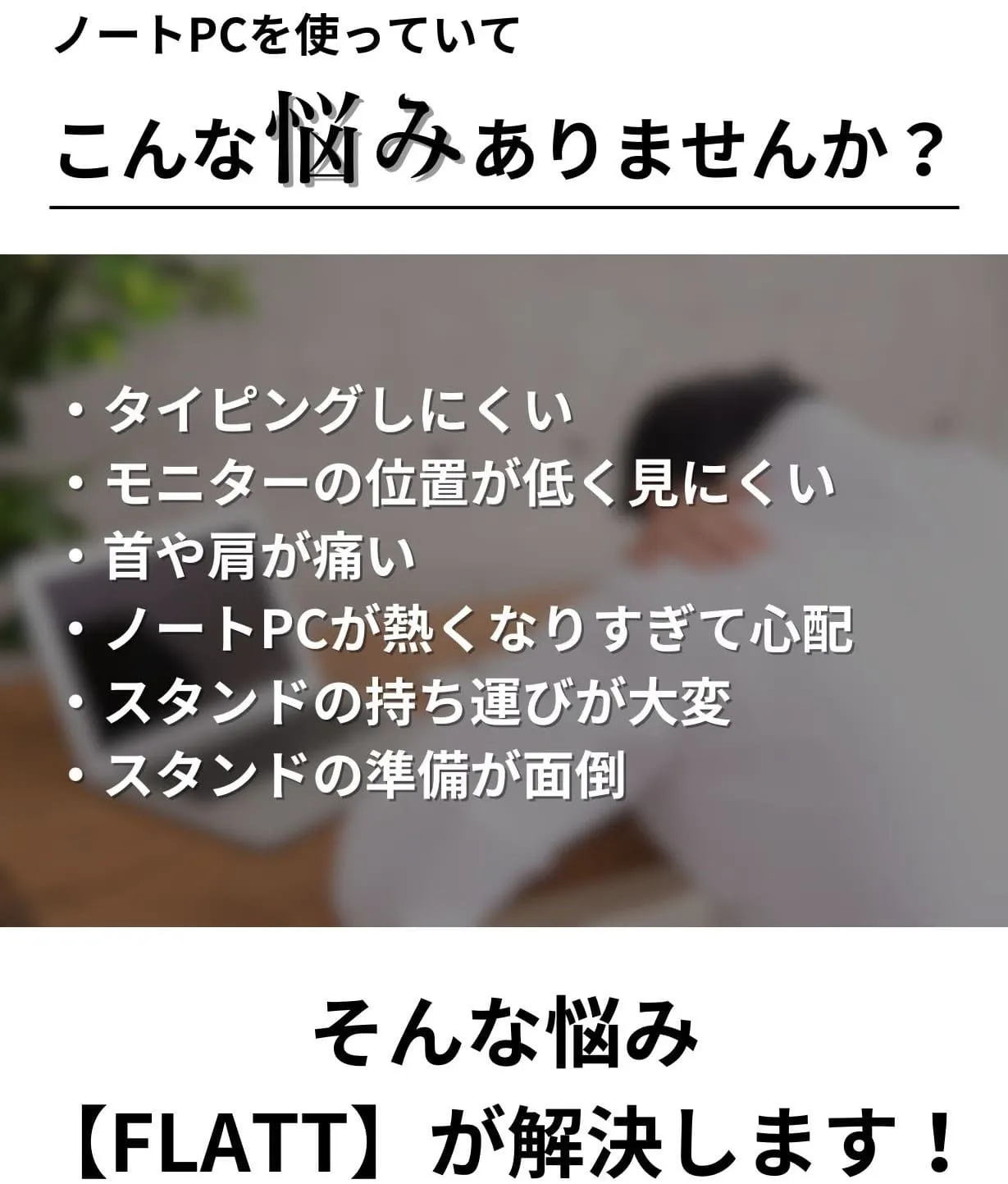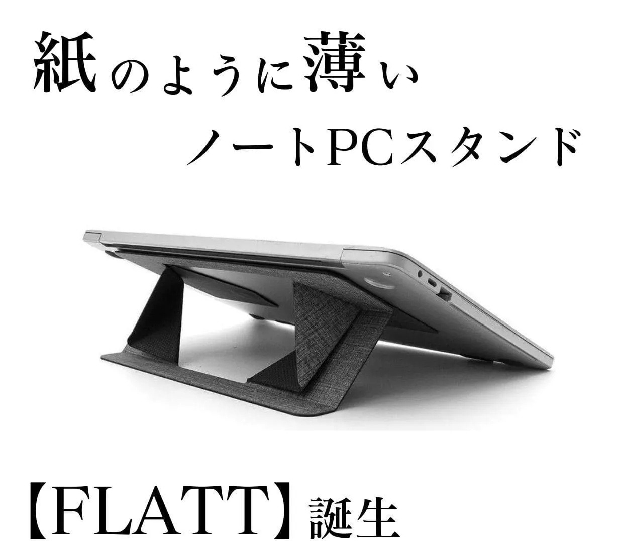 PCスタンドは欲しいけど見た目が悪くなるのはイヤだ、持ち歩きたいけど忘れそう。そんな悩みを何とか解決できないかと思い今回のノートPCスタンド【FLATT】の販売にいたりました。