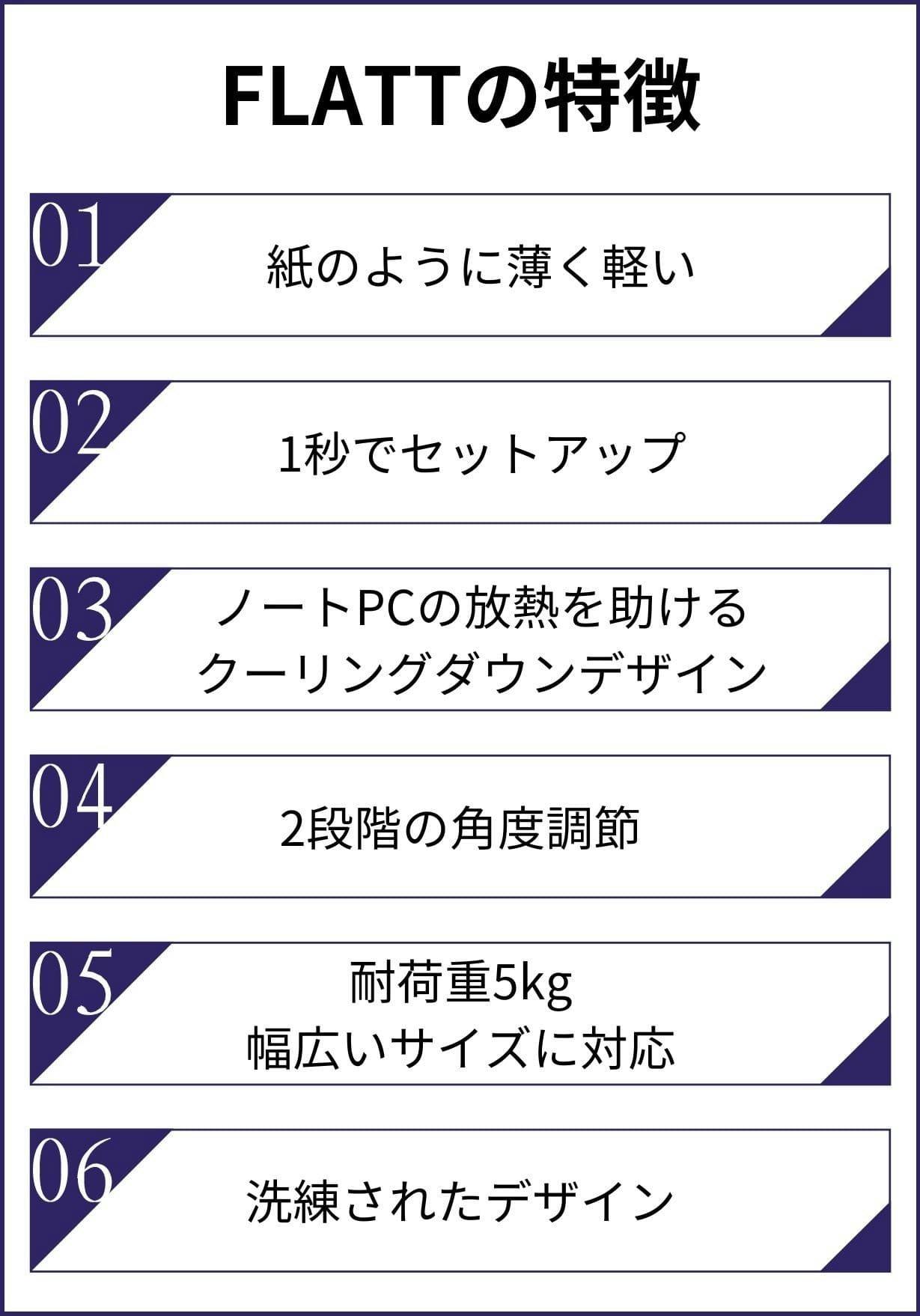 今回はノートPCスタンド【FLATT】をご紹介させていただきました。私自身、毎日ノートPCを使って仕事をしています。その中で、姿勢が悪くなり、肩や首、腰の痛みから集中力が低下したり、作業負荷からPCが熱くなったりと、様々な悩みを抱えていました。